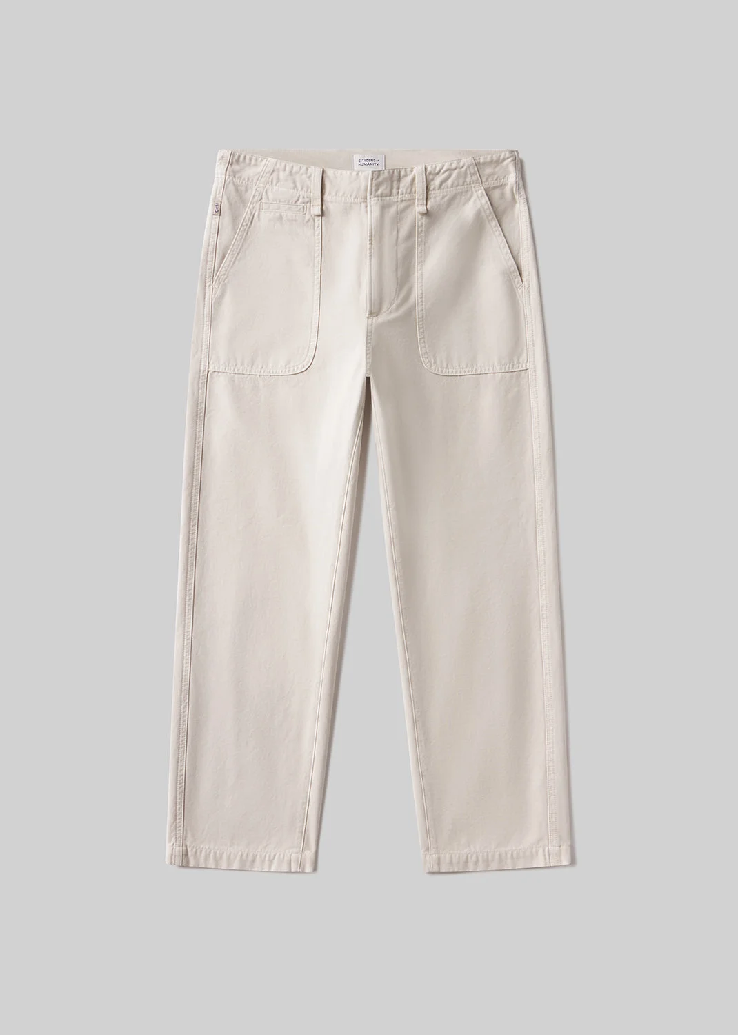 The Winslow Utility is the new boyfriend reimagined—sitting just above the hip with a relaxed, vintage-inspired leg. Crafted from midweight, rigid twill made with regenerative cotton, it’s designed to hold its shape while softening beautifully over time. Effortlessly cool and endlessly versatile, it brings a refined utility edge to everyday wear. This fit is true to size. Looks Like: Light grey utility pant with large front pockets and green undertones Feels Like: Midweight rigid, non-stretch twill made to hold its shape all day long This product is made with regenerative cotton from Citizens of Humanity Group’s Regenerative Cotton Program. Our program collaborates closely with farmers both domestically and internationally, nurturing growth, fostering education, and encouraging the widespread adoption of regenerative agricultural practices. From our HUMANITY Collection DETAILS Closure: Zip Fly Rise: 10 3/8" Inseam: 27" Leg Opening: 16 1/4" Model is 5'10" and wearing a size 27 Fabric Content: 100% Regenerative Cotton Care Instructions: Machine wash cold inside out with like colors. Do not bleach. Tumble dry low. Made in Turkey with imported materials 2276-576_PASTN