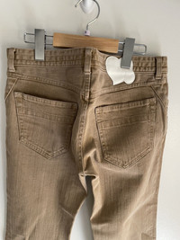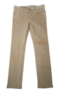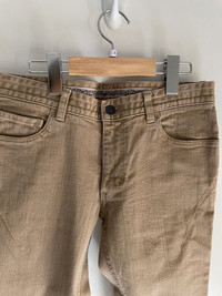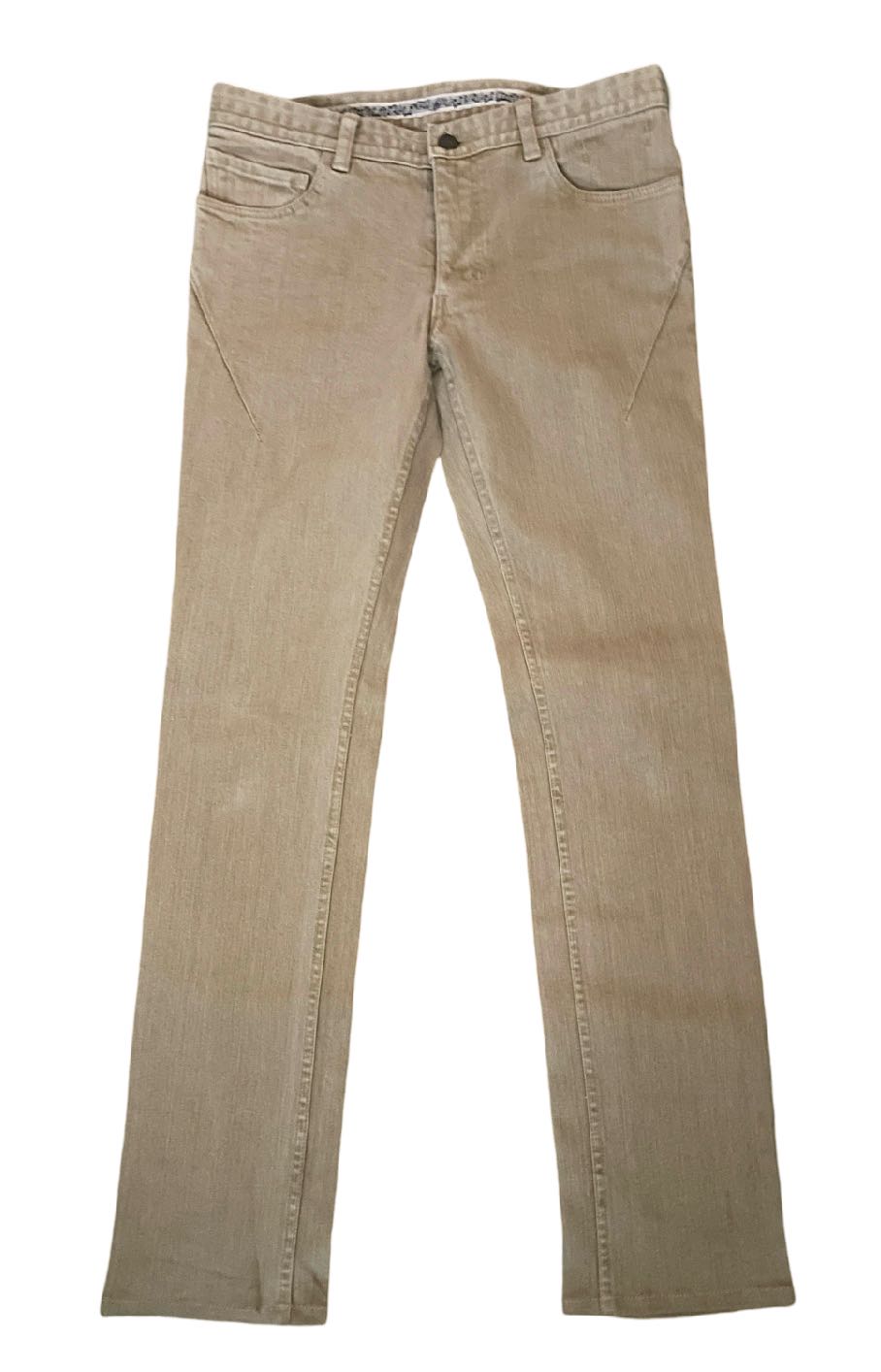 Beautiful tan/beige denim from runway with iconic leather heart patch and "Pain." Tab on back pocket. Riri zippers. Musical note detailing, insane quality denim made in Japan (some of the best denim ever made). Fits slim - see runway pic provided for reference. All sales are final