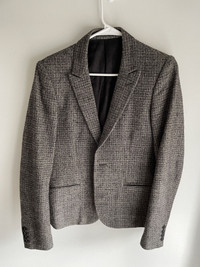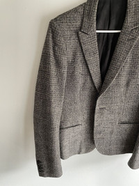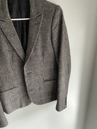 Beautiful cropped, sharp silhouette wool blazer from Japanese brand Pledge which was designed and founded by Hidenori Miura who worked press for the early years of Takahiro Miyashita’s Number (N)ine. Cupro lining, single vent, button sleeves elongated sleeves cropped cut, peak lapels, gorgeous grey wool fabric. Made in Japan and high quality constructed. Reminds me a lot of some Rick Owens cropped blazers. Fits a 46/small. If you wear a size 2 in Number (N)ine or a 46 in Hedi Dior this will fit perfect. All sales are final