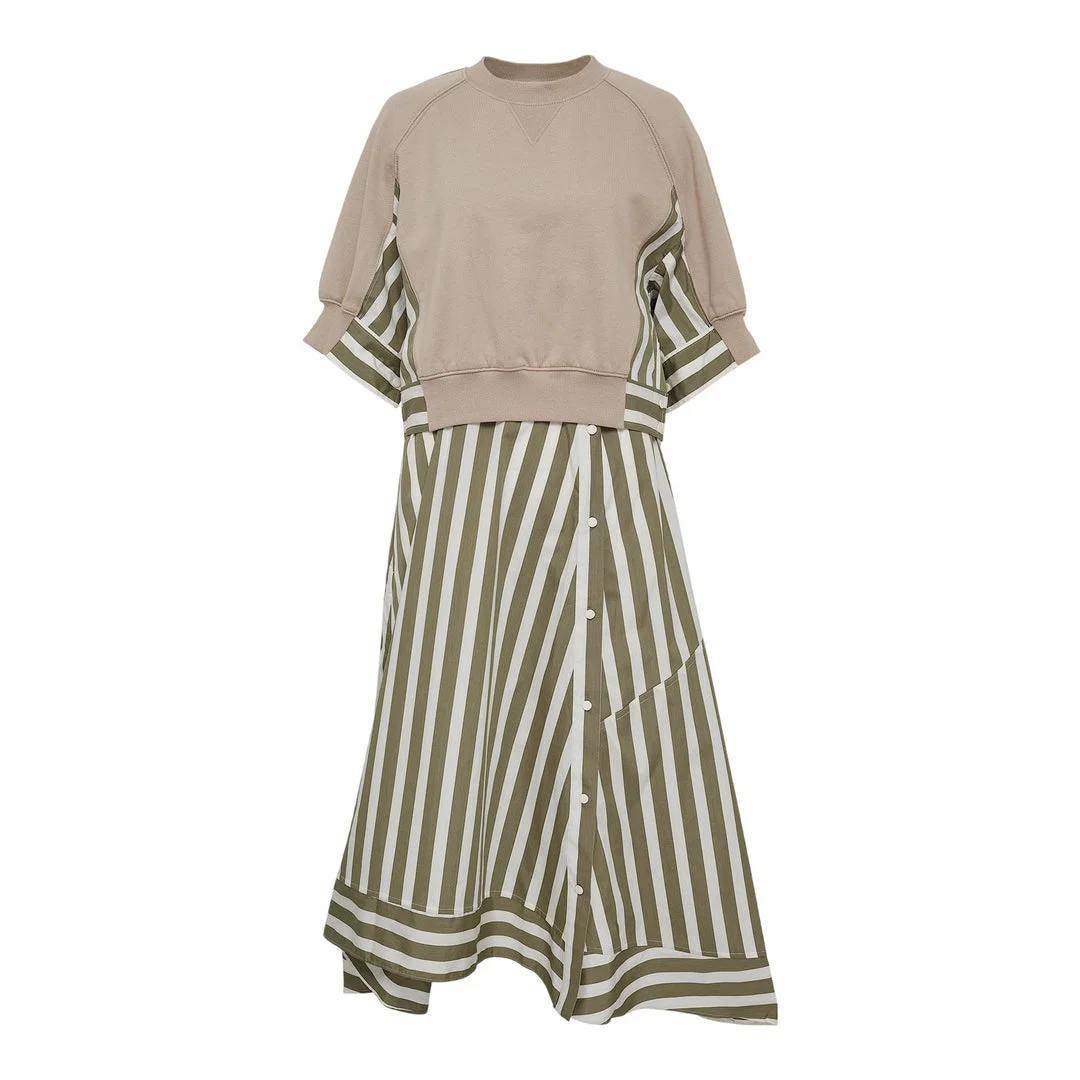 600071094BGE0XS / P251-90966UFT/00/CO310 - Cotton blend sweatshirt top construction - Striped woven midi skirt panel - 3/4 length sleeves with ribbed cuffs - Button-front closure on skirt - Asymmetrical wrap hem detail - Crew neckline with contrast V-insert - Relaxed fit bodice with A-line skirt 3.1 Phillip Lim 3/4 Sleeve Sweatshirt Combo Dress delivers contemporary hybrid styling with innovative construction. Crafted from premium cotton blend knit featuring a striped woven skirt panel, combining casual comfort with sophisticated tailoring. The unique two-piece aesthetic creates a modern silhouette that transitions seamlessly from day to evening.