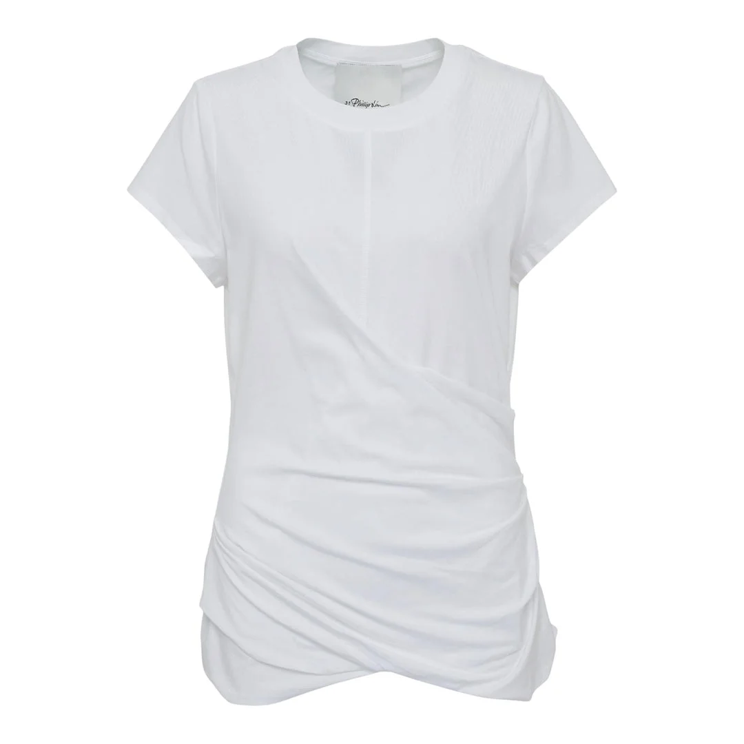 600071069WHT0XS / P251-10321JCM/00/WH100 - Asymmetrical wrap detail at waist - Twisted hem construction - Crew neckline - Short sleeves - Soft modal blend fabric - Relaxed fit through body - Side gathering detail 3.1 Phillip Lim Draped Short Sleeve T-Shirt delivers contemporary elegance with modern draping techniques and flattering silhouette construction. Crafted from soft modal blend in crisp white, featuring asymmetrical wrap detail at the waist for dimensional styling. The signature twisted hem and relaxed fit create effortless sophistication for everyday luxury dressing.