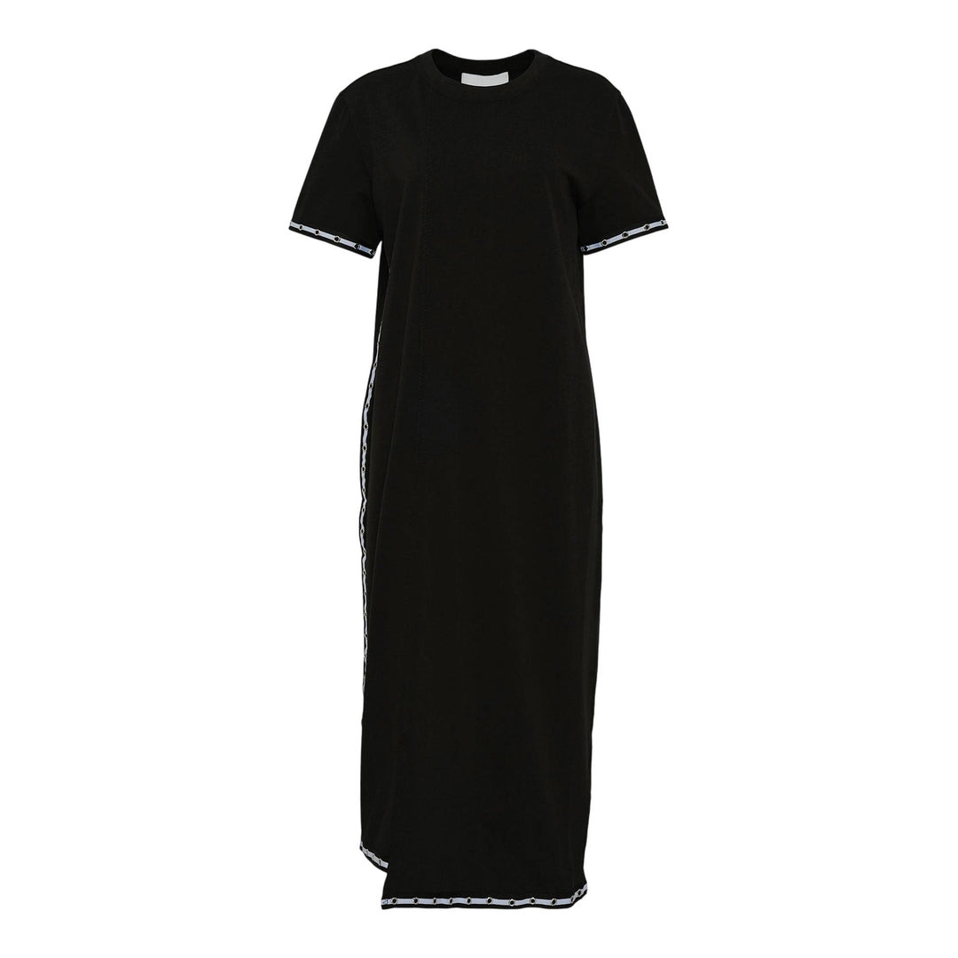 600071092BLK0XS / P251-90964MSJ/00/BA001 - Round neckline - Short sleeves - Contrast stripe detailing on sleeves and hem - Midi length - Premium cotton jersey construction - Relaxed fit - Pull-on style The 3.1 Phillip Lim Patchwork Stripe T-Shirt Dress delivers contemporary minimalism with architectural construction and modern versatility. Crafted from premium cotton jersey in sophisticated black, featuring contrast white stripe detailing along the sleeves and hem. The relaxed midi silhouette and signature clean aesthetic create an effortless statement piece for contemporary wardrobes.
