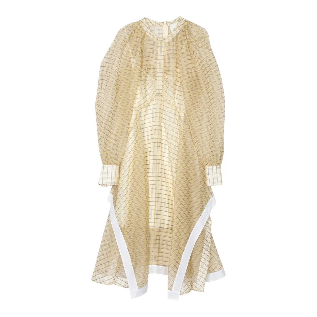 300048242BGE-02 / P5P251-90963POG/00/HA244 - Sheer organza construction - Classic plaid pattern in neutral tones - Long balloon sleeves with fitted cuffs - Asymmetrical flounce hemline - Gathered neckline detail - Midi length - Relaxed fit through body The 3.1 Phillip Lim Plaid Organza Flounce Hem Dress delivers feminine elegance with contemporary architectural silhouette. Crafted from lightweight organza in neutral plaid pattern, featuring gathered sleeves and dramatic asymmetrical hemline with flounce detailing. The sophisticated check pattern and structured draping create a refined statement piece for modern wardrobes.