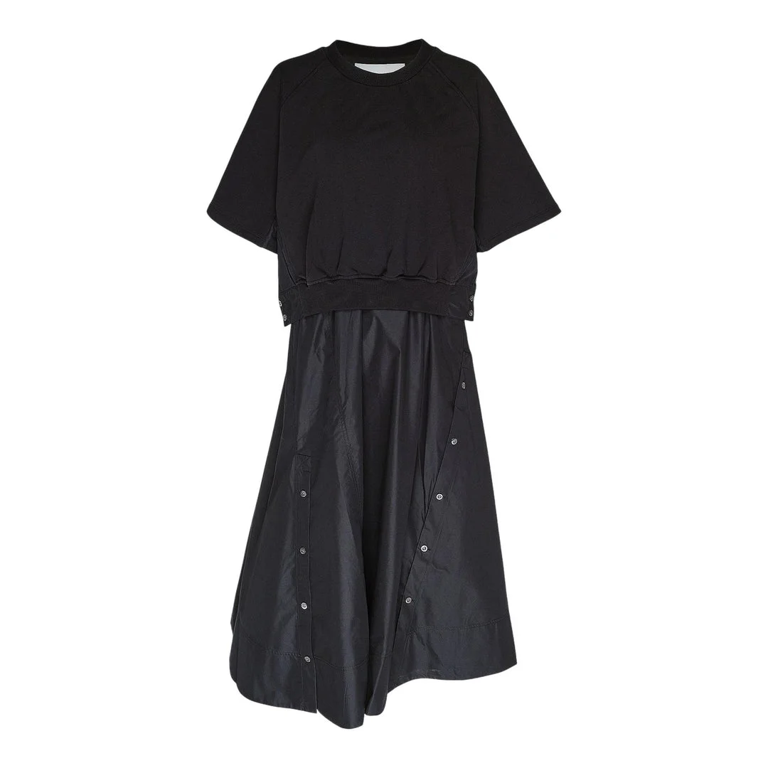 600060824BLK00S / E232-9921FTS/00/BA001 - French terry knit upper with short sleeves - Poplin shirt panel lower section - Snap button closure details - Crew neckline - Relaxed fit through body - Midi length - Asymmetrical hemline The 3.1 Phillip Lim Short Sleeve French Terry Combo Dress delivers modern layered styling with comfortable construction and architectural detail. Made from soft French terry knit combined with crisp poplin shirting elements, featuring snap button closure details throughout the lower panel. The innovative combination of materials and deconstructed silhouette creates a contemporary statement piece that bridges casual comfort with refined design.