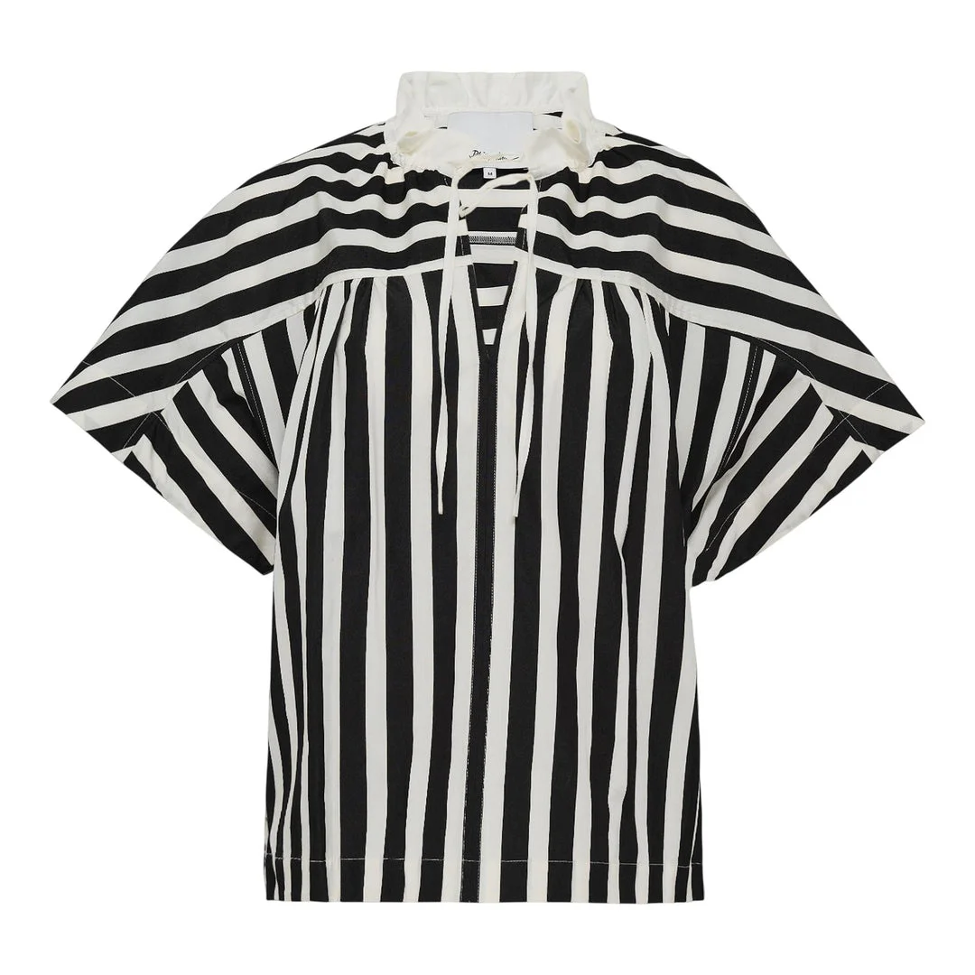 600071077STR0XS / P251-21717FFS/00/BB001 - Open neckline with tie closure - Wide cape-style sleeves - Black and white stripe pattern - Lightweight woven construction - Relaxed fit - Gathered yoke detail 3.1 Phillip Lim Striped Open Neck Top delivers contemporary sophistication with versatile styling options. Crafted from lightweight woven fabric in classic black and white stripes, featuring an open neckline with adjustable tie closure. The relaxed silhouette and cape-like sleeves create effortless elegance for modern wardrobes.