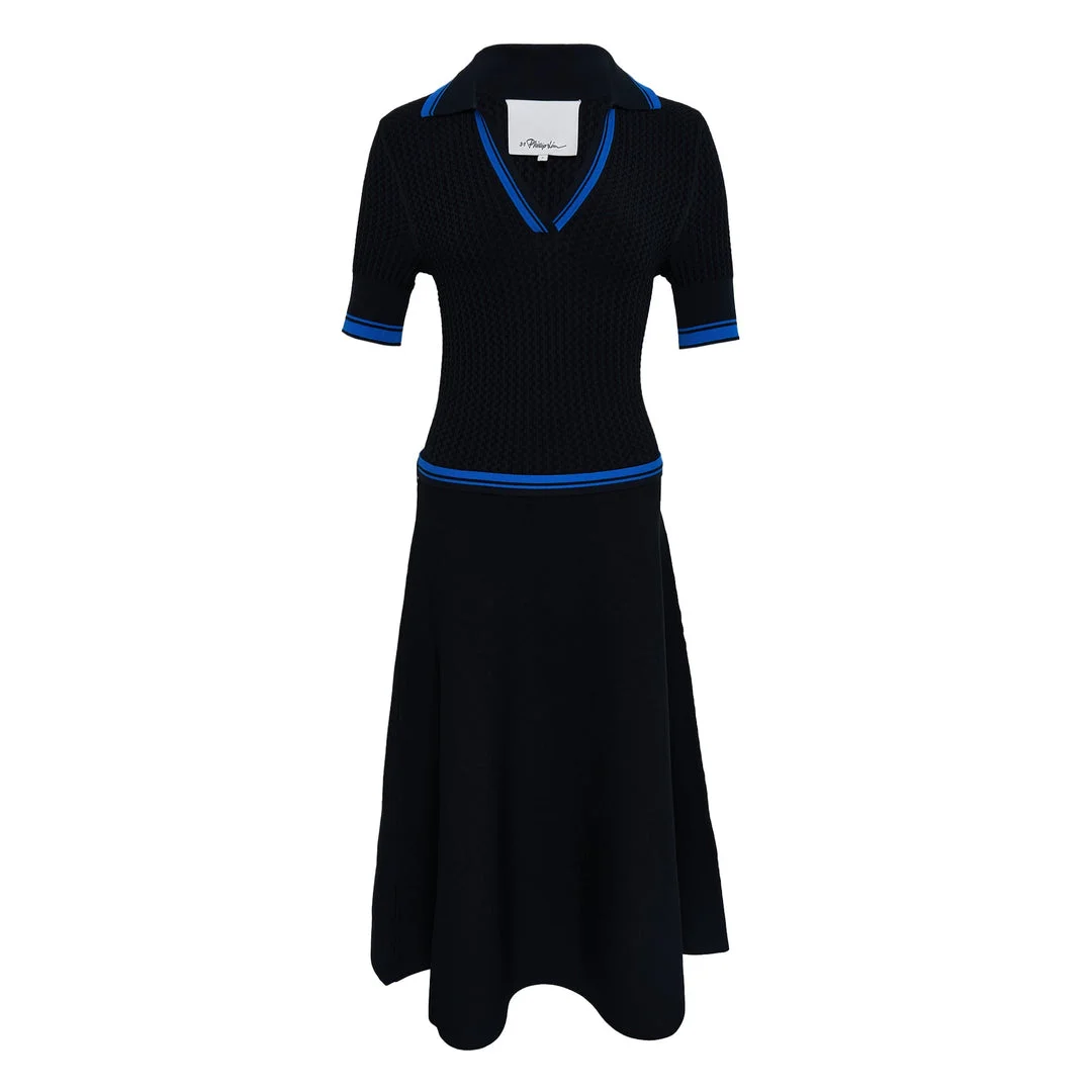 600078848BLK00L / E262-70515VTR/00/CA086 - Polo collar with contrast blue trim - Short sleeves with ribbed cuffs - Textured ribbed knit construction - Fitted bodice with contrast waistband - A-line midi skirt - Pullover style 3.1 Phillip Lim Textured Rib Polo Midi Dress delivers contemporary sophistication with sport-luxe inspired design and feminine silhouette. Crafted from textured ribbed knit with contrasting blue trim detailing at collar, cuffs, and waistband for refined athletic elegance. The fitted bodice and flowing A-line skirt create a polished midi length perfect for transitional dressing.