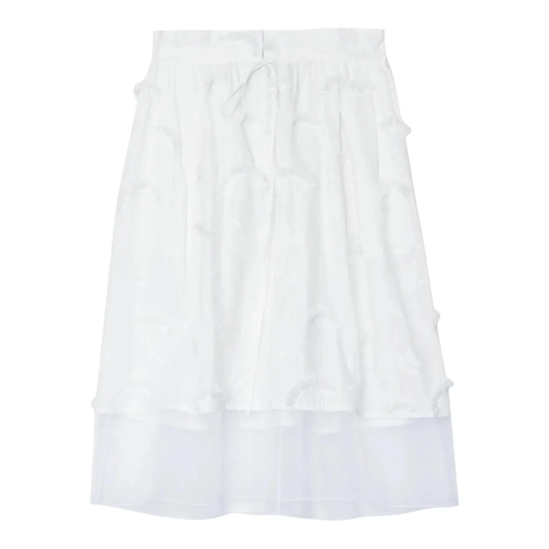 600071080WHT002 / P251-36172FCV/00/WH100 - Adjustable tie-waist closure - Tiered ruffle construction - Lightweight organza fabric - Midi length - Elastic waistband - Flowing silhouette - Lined interior The 3.1 Phillip Lim Tie-Waist Midi Skirt With Organza delivers contemporary elegance with sophisticated layered construction. Crafted from lightweight organza fabric in crisp white, featuring delicate ruffled tiers that create beautiful movement and texture. The adjustable tie-waist detail and flowing midi length embody the brand's signature modern femininity.