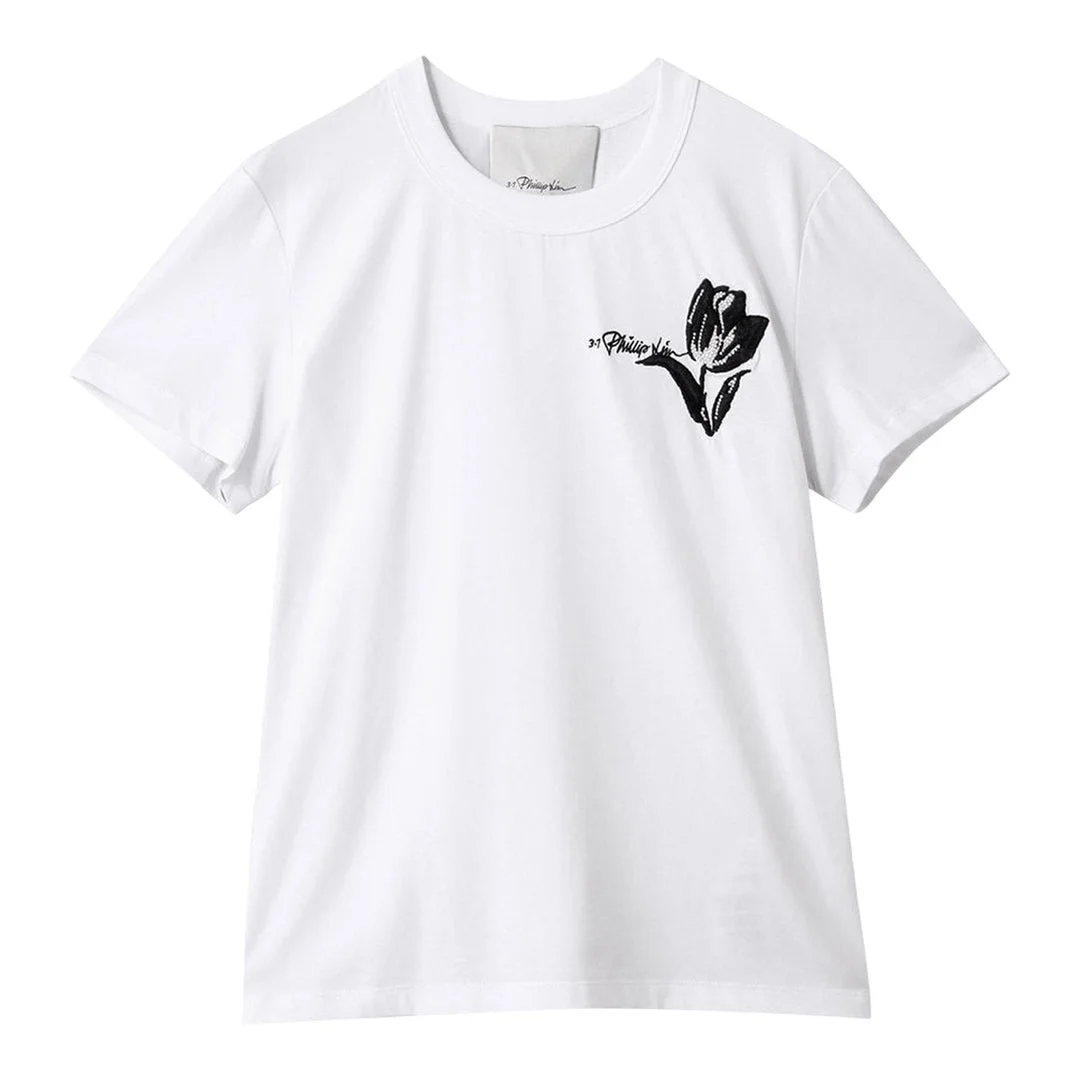 300048219WHT-XS / P5P251-10320PJB/00/WH100 - Black tulip embroidery at chest - Cropped length silhouette - Short sleeves - Round neckline - Premium cotton construction - Relaxed fit 3.1 Phillip Lim Tulip Embroidered Cropped Short Sleeve Tee delivers contemporary elegance with artistic floral detailing. Crafted from premium cotton in crisp white, featuring intricate black tulip embroidery positioned at the chest for subtle sophistication. The cropped silhouette and relaxed fit create a modern feminine aesthetic perfect for elevated casual styling.