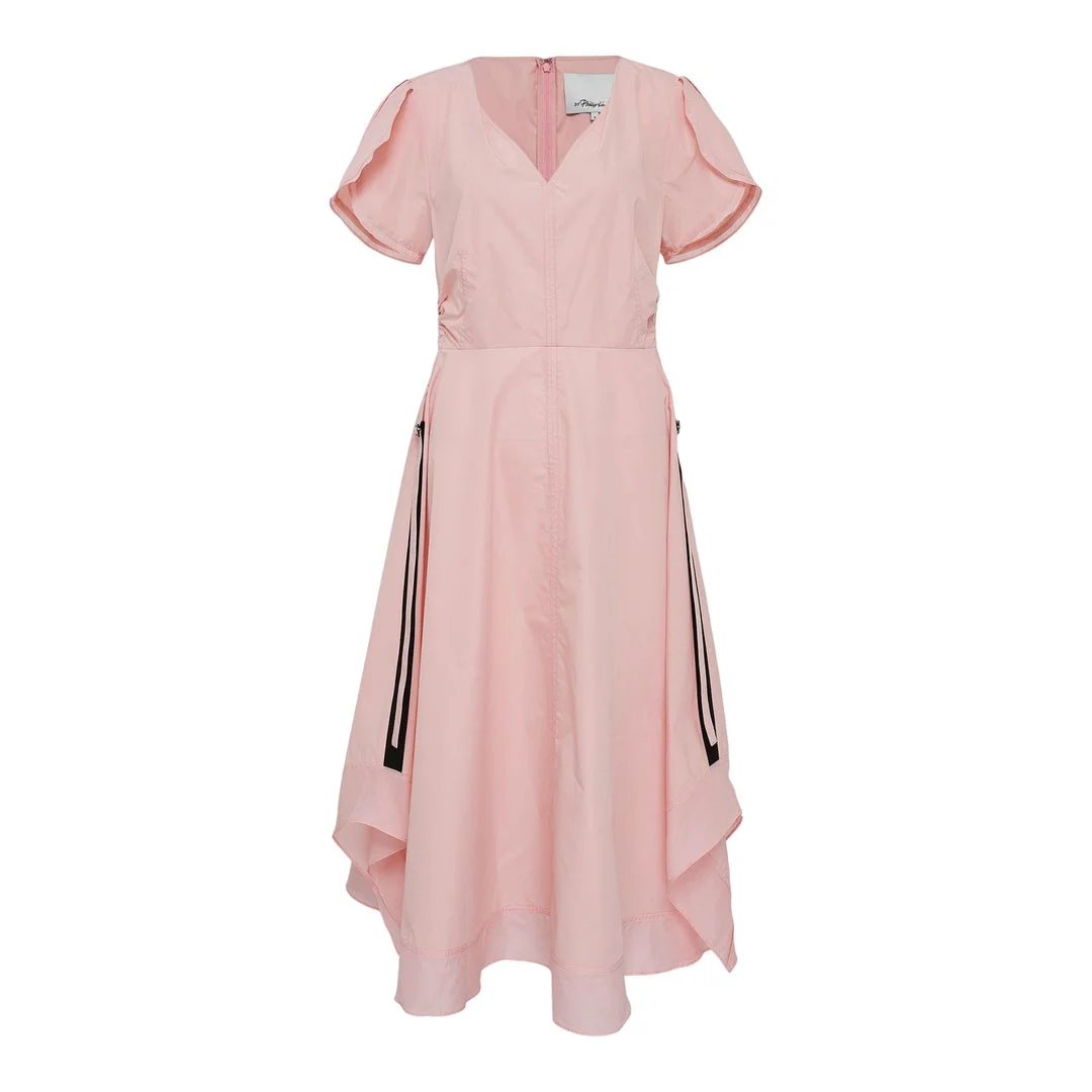 600071090PNK--0 / P251-90960LCE/00/PE684 - Tulip puffed sleeves with elastic cuffs - Deep V-neckline - Asymmetrical handkerchief hemline - Back zip closure - Lightweight flowing fabric - Relaxed A-line silhouette - Midi length - Unlined construction The 3.1 Phillip Lim Tulip Sleeve V-Neck Dress delivers modern femininity with architectural sophistication and flowing elegance. Crafted from lightweight silk-like fabric in soft blush pink, featuring distinctive puffed tulip sleeves and a flattering V-neckline that elongates the silhouette. The asymmetrical hemline and relaxed fit create effortless movement while maintaining the brand's signature contemporary aesthetic.
