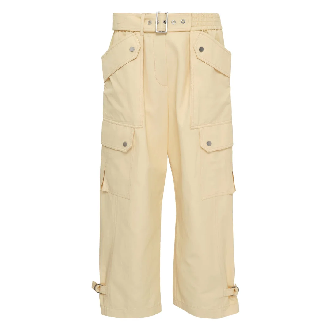 600078831BGE00L / E261-51342UCV/00/GI235 - Adjustable buckle belt - Multiple cargo pockets with snap closures - High-waisted design - Ankle cuff straps with buckle details - Cotton twill construction - Relaxed tapered fit - Side zip pockets - Military-inspired hardware The 3.1 Phillip Lim Utility Cargo Pants deliver contemporary functionality with elevated streetwear design. Crafted from durable cotton twill in warm sand beige, featuring multiple cargo pockets and adjustable buckle belt for versatile styling. The structured silhouette and military-inspired details create a modern take on utilitarian fashion.