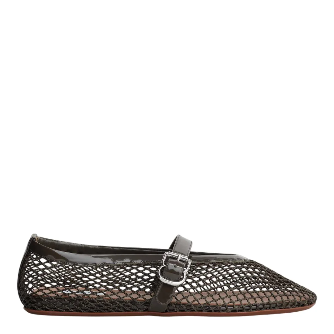 600071396OLV037 / PF25-AA3A029TK007/00/610 - Mesh upper with patent leather trim - Adjustable ankle strap with buckle closure - Pointed toe silhouette - Leather lined interior - Flat heel construction - Slip-resistant sole ALAIA Ballet Flats deliver sophisticated elegance with innovative mesh construction and luxurious patent leather accents. Crafted from premium mesh overlay with glossy patent leather trim and adjustable ankle strap, featuring the brand's signature architectural design. The sleek silhouette and modern materials create a contemporary take on classic ballet flat styling.