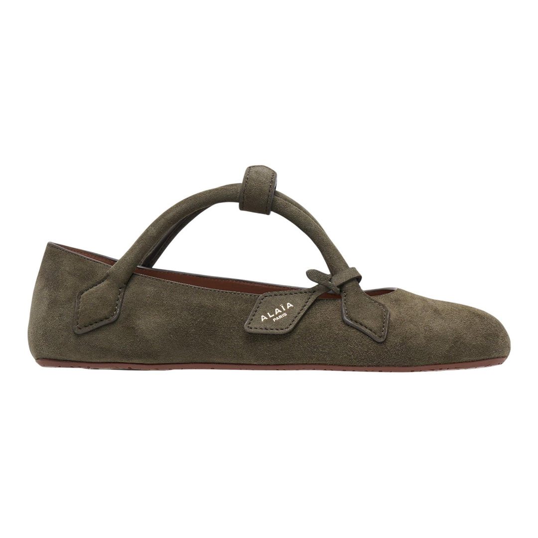 600074580BRN036 / AW-AA3A1011C0C05/00/809 - Premium suede goatskin construction - Signature curved top handle - Slip-on design with secure ankle strap - Leather-lined interior - Flat sole construction - Minimalist sculptural silhouette - ALAIA logo detailing ALAIA Ballet Flats deliver sophisticated luxury with artisanal French craftsmanship and timeless elegance. Crafted from premium suede goatskin in earthy olive green, featuring the signature curved top handle and refined minimalist silhouette. The architectural design and buttery-soft suede construction create an iconic statement piece that embodies ALAIA's sculptural aesthetic.