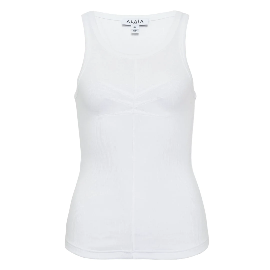600082630WHT034 / PS26-AA9H1389J085C/00/000 - Bamboo fiber blend construction - Strategic dart seaming for shape - Sleeveless design - Ribbed neckline finish - Body-conscious fit - Moisture-wicking properties - Sustainable fiber content ALAIA Darts Tank Top delivers sculptural precision with sustainable bamboo-blended construction for exceptional comfort and breathability. Crafted from innovative bamboo fiber blend in pristine white, featuring strategic dart construction that creates the brand's signature body-conscious silhouette. The eco-conscious material and architectural shaping exemplify ALAIA's commitment to both luxury craftsmanship and contemporary sustainability.