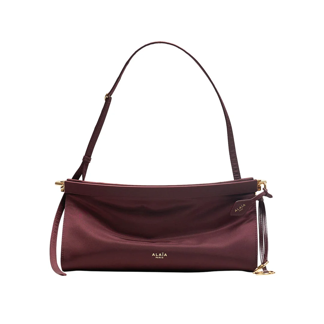 600082608BUR0OS / PS26-AA1S01430I155/00/325 - Premium nylon construction - Adjustable shoulder strap - Gold-tone hardware details - ALAIA Paris signature branding - East-west orientation design - Structured silhouette - Interior compartments - Convertible carrying options The ALAIA East West M Nylon Bag delivers contemporary luxury with versatile functionality for modern lifestyles. Crafted from premium burgundy nylon with adjustable shoulder strap and gold-tone hardware accents throughout. The signature ALAIA Paris branding and structured silhouette create an elevated accessory that transitions seamlessly from day to evening.