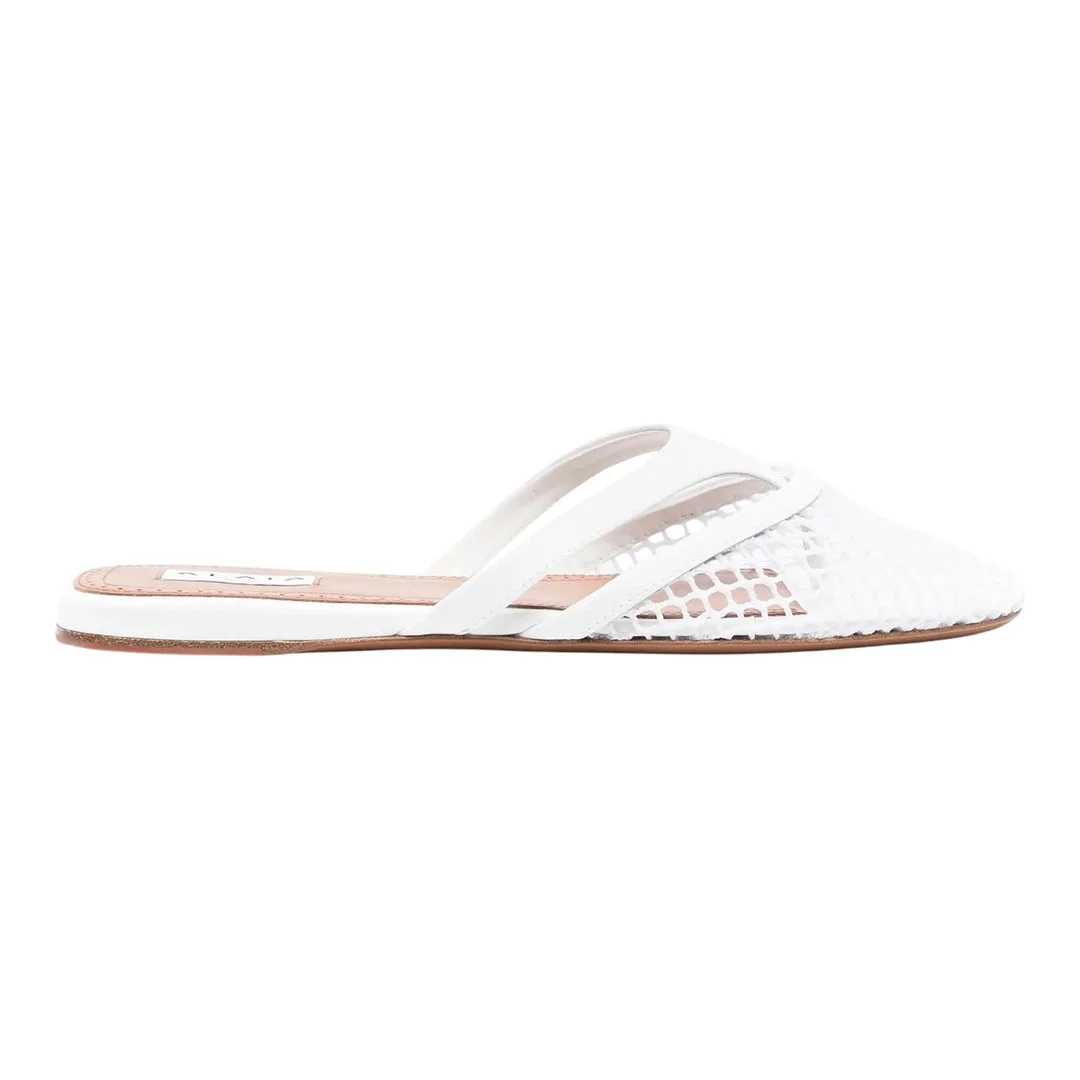600066070WHT037 / SS25-AA3M101TK007/00/010 - Premium white leather construction - Signature fishnet perforated design - Geometric cutout patterns - Slip-on mule silhouette - Flat heel construction - Leather sole - Open-toe design ALAIA Fishnet Mules deliver iconic French luxury with the brand's signature sculptural craftsmanship and architectural detailing. Crafted from premium white leather with intricate fishnet-inspired perforated design, featuring the maison's distinctive geometric cutout patterns. The flat silhouette and slip-on construction showcase ALAIA's mastery of leather craftsmanship with contemporary elegance.