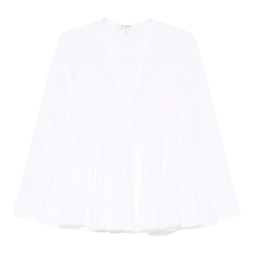 600066076WHT038 / SS25-AA9C0976T611A/00/000 - Flared silhouette design - Button-down front closure - Long sleeves with fitted cuffs - Classic collar - Premium woven fabric construction - Regular fit through body - French seam finishing ALAIA Flare Shirt delivers sophisticated Parisian elegance with architectural silhouette and premium construction. Crafted from luxurious woven fabric in crisp white, featuring the brand's signature sculptural approach to feminine design. The flared cut and meticulous tailoring create a refined statement piece that embodies ALAIA's legacy of technical excellence.