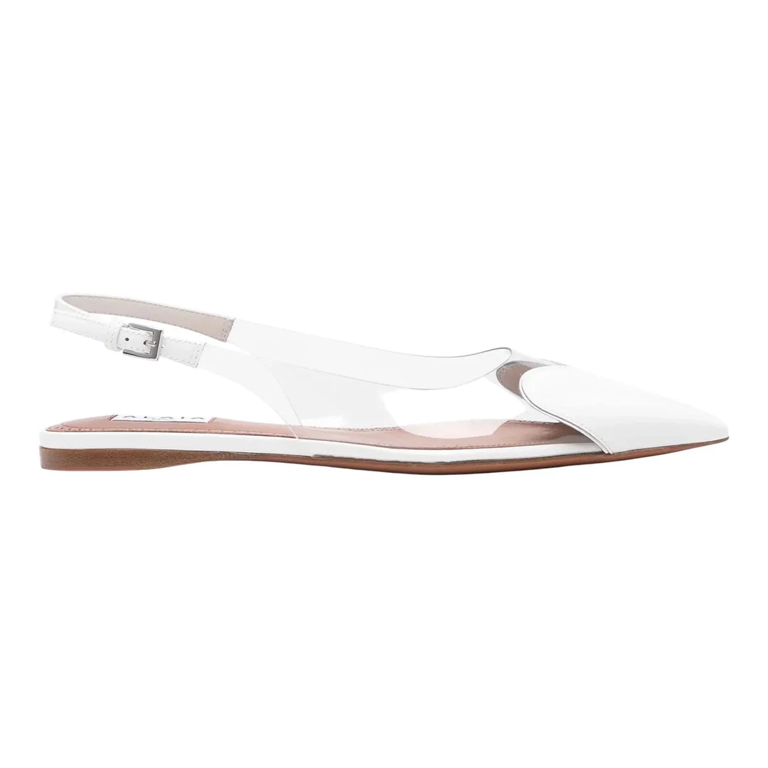 600054667WHT5.5 / AA3E047CK150/00/010 - Premium white leather construction - Adjustable ankle strap with buckle closure - Pointed toe silhouette - Flat sole with leather outsole - Leather lining and insole - Slip-on design with slingback strap ALAIA Flat Slingbacks deliver timeless elegance with French luxury craftsmanship and sophisticated minimalist design. Crafted from premium white leather with a streamlined silhouette, featuring the brand's signature clean lines and architectural precision. The refined construction and versatile styling make these an essential addition to any luxury footwear collection.