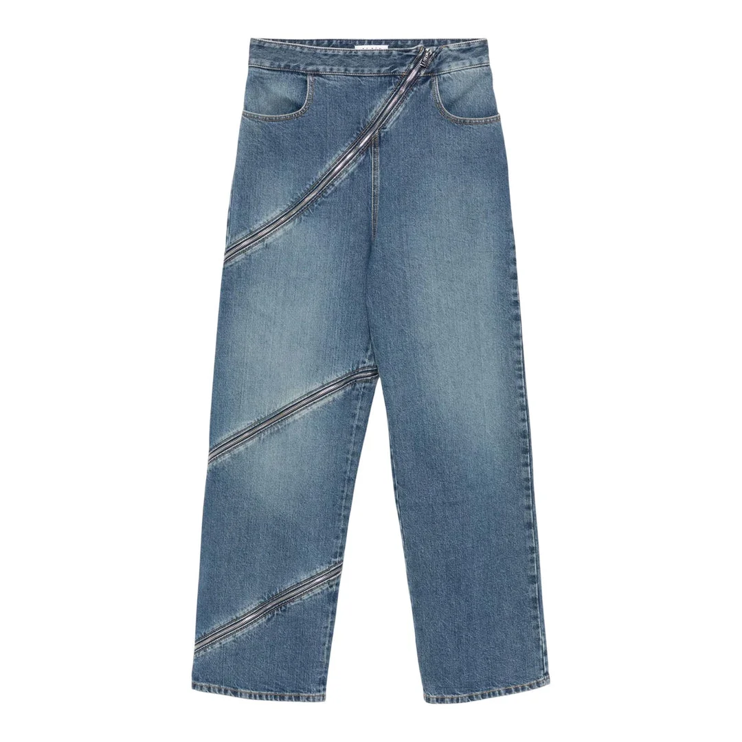 600062909BLU040 / PS25-AA9P0295T536A/00/525 - Diagonal zip closures creating spiral effect - High-waisted construction - Classic five-pocket styling - Premium denim fabrication - Architectural seaming details - Relaxed straight leg fit - French luxury craftsmanship ALAIA Spiral Pants deliver architectural denim design with innovative construction techniques and luxurious French craftsmanship. Crafted from premium blue denim with distinctive diagonal zip detailing that creates a dynamic spiral effect across the front and legs. The sculptural silhouette and signature ALAIA precision tailoring transform classic denim into a haute couture statement piece.