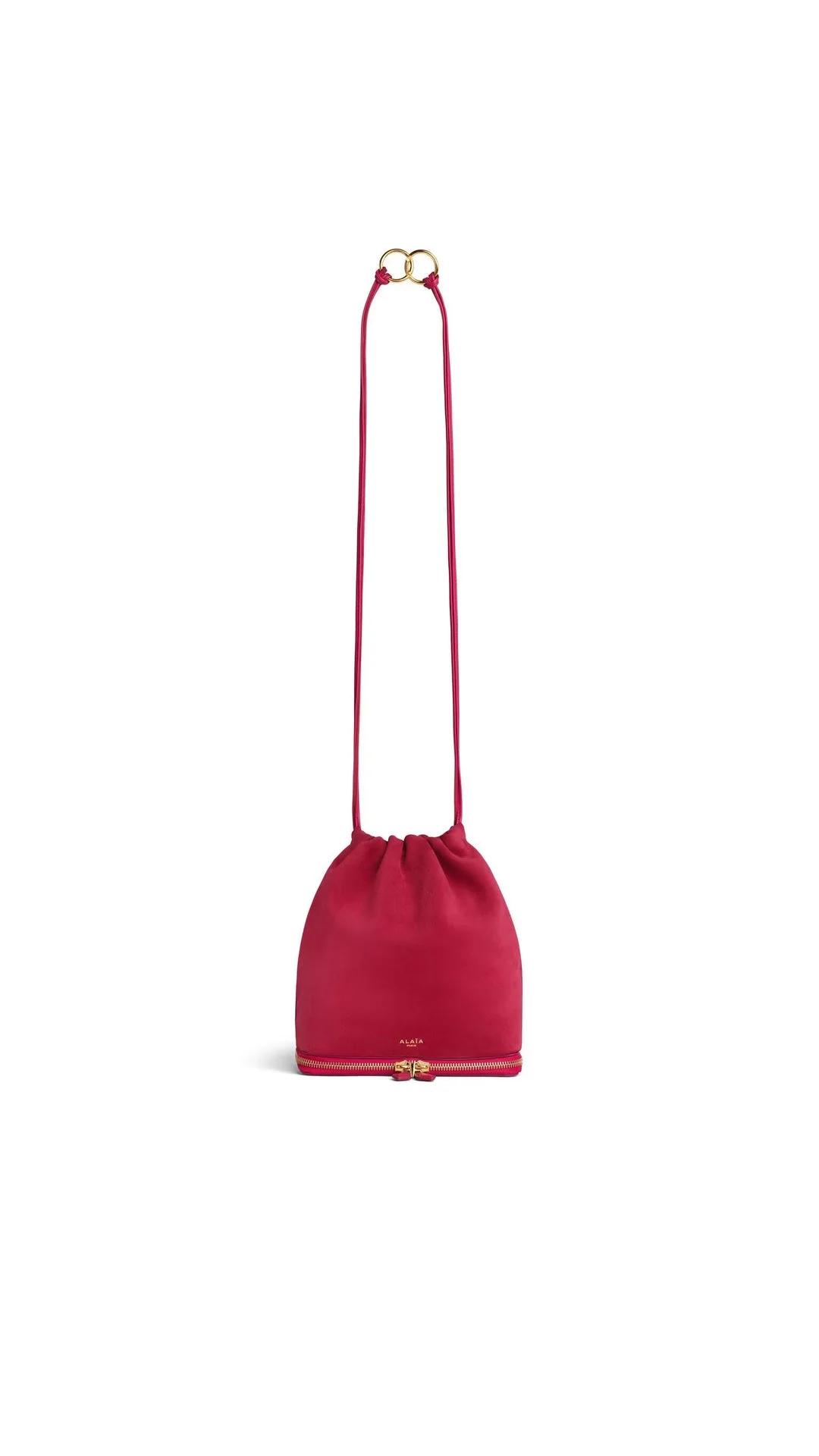600082604PNK0OS / PS26-AA1L2029CA577/00/424 - Premium goatskin leather construction - Drawstring closure with gold-tone rings - Adjustable shoulder strap - Zip detail at base - Structured bucket silhouette - Embossed ALAIA logo - Interior fabric lining ALAIA Squared Bucket delivers sophisticated luxury with architectural design and premium goatskin construction. Crafted from supple goatskin leather in rich burgundy red, featuring the brand's signature sculptural silhouette and gold-tone hardware accents. The structured bucket shape and adjustable drawstring closure create a timeless statement piece for discerning wardrobes.