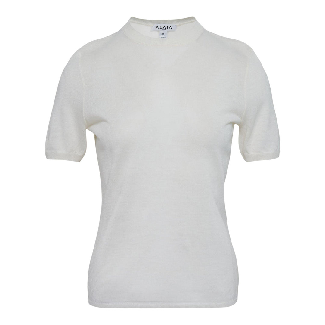 600074589OWT038 / AW-AA9H1369K097B/00/054 - Premium knitted construction - Short sleeves with ribbed cuffs - Mock neckline - Fitted silhouette - French seam finishing - Structured knit fabric ALAIA T-Shirt delivers luxury basics with French couture craftsmanship and sculptural design precision. Made from premium knitted fabric in classic ivory, featuring the brand's signature clean lines and refined construction. The structured knit and precise tailoring create an elevated essential that embodies ALAIA's architectural aesthetic.