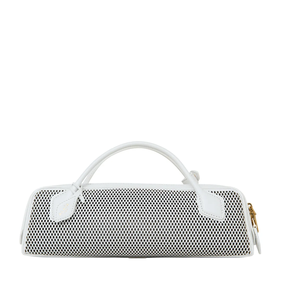 600066060WHT0OS / SS25-AA1S06026CA330/00/010 - Signature diamond-pattern perforations - Premium leather construction - Top handle design - Gold-tone zip closure - Contrasting white leather trim - Structured silhouette - Hand-finished details The ALAIA Teckel Clutch delivers iconic French luxury with the brand's signature perforated leather craftsmanship. Crafted from premium white leather featuring the distinctive diamond-pattern perforations and contrasting handle construction. The architectural form and meticulous hand-finished detailing showcase ALAIA's mastery of leather goods design.