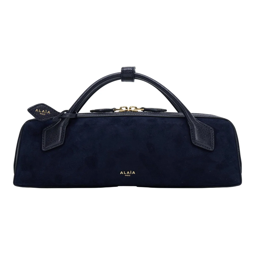 600074568BLK0OS / AW-AA1S06026CA577/00/537 - Premium suede body construction - Goatskin leather handles and trim - Top zip closure with leather pull tab - Gold-tone metal hardware - Structured rectangular silhouette - Interior fabric lining - Compact clutch size ALAIA Teckel Clutch delivers Parisian luxury with exquisite dual-material construction for sophisticated evening occasions. Crafted from premium suede body with contrasting goatskin leather handles and trim, featuring the brand's signature architectural silhouette. The structured design and gold-tone hardware create an elegant statement piece that embodies ALAIA's distinctive aesthetic.