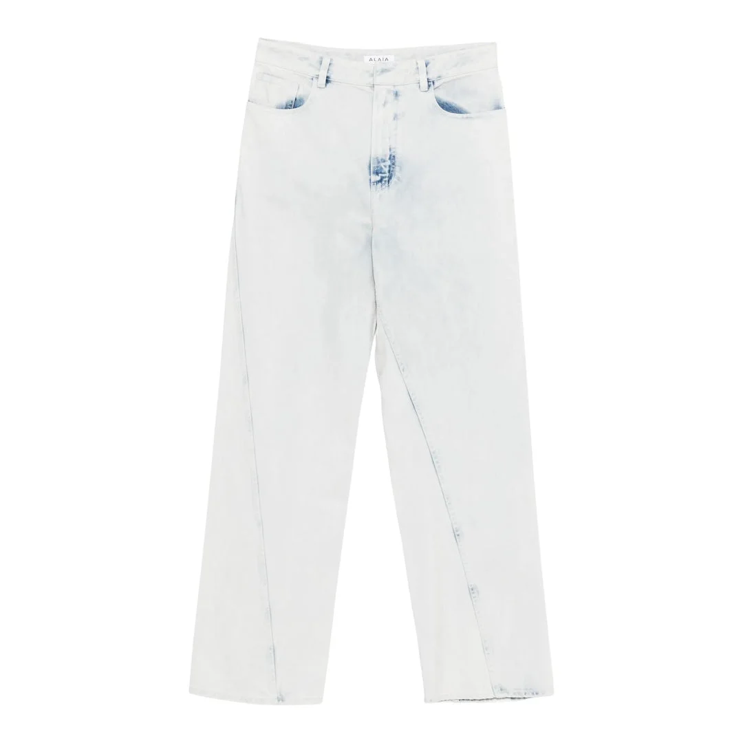 600071413WHT038 / PF25-AA9P1181D005B/00/523 - Light bleached denim wash - Twisted seam construction - Classic five-pocket styling - Button fly closure - High-rise waistband - Straight leg silhouette - Premium cotton denim ALAIA Twisted Pants deliver contemporary sophistication with architectural silhouette and modern tailoring. Crafted from premium cotton denim in light bleached wash, featuring the brand's signature structural approach to everyday essentials. The innovative twisted seam construction and refined fit create a statement piece that elevates casual wardrobes.