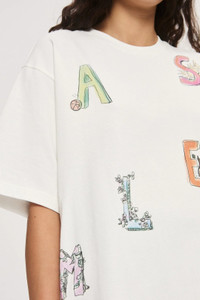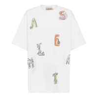 600070421WHTXXS / 5483T/00/CREAM - Scattered colorful alphabet letter graphics - Short sleeves - Crew neckline - Premium cotton construction - Relaxed fit - Front and back graphic placement ALEMAIS Court Tee delivers contemporary streetwear with artistic letter graphics and premium cotton construction. Crafted from soft cotton in classic white, featuring colorful illustrated alphabet letters scattered across the front and back. The relaxed fit and playful design aesthetic create a statement piece that blends luxury comfort with creative expression.