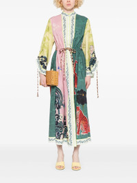 300048154MLT-04 / P55405D/00/MULTI - Lightweight silk construction - Contrasting panel design - Wide dramatic sleeves with tie details - Button-front closure - Maxi length - Animal and botanical print motifs - Decorative border trim - Relaxed flowing fit The ALEMAIS Rochester Shirtdress delivers bohemian luxury with artisanal print design and flowing silhouette. Crafted from lightweight silk featuring contrasting panels in pink and teal with ornate animal motifs and decorative borders. The dramatic wide sleeves and maxi length create an effortlessly elegant statement piece with the brand's signature artistic aesthetic.