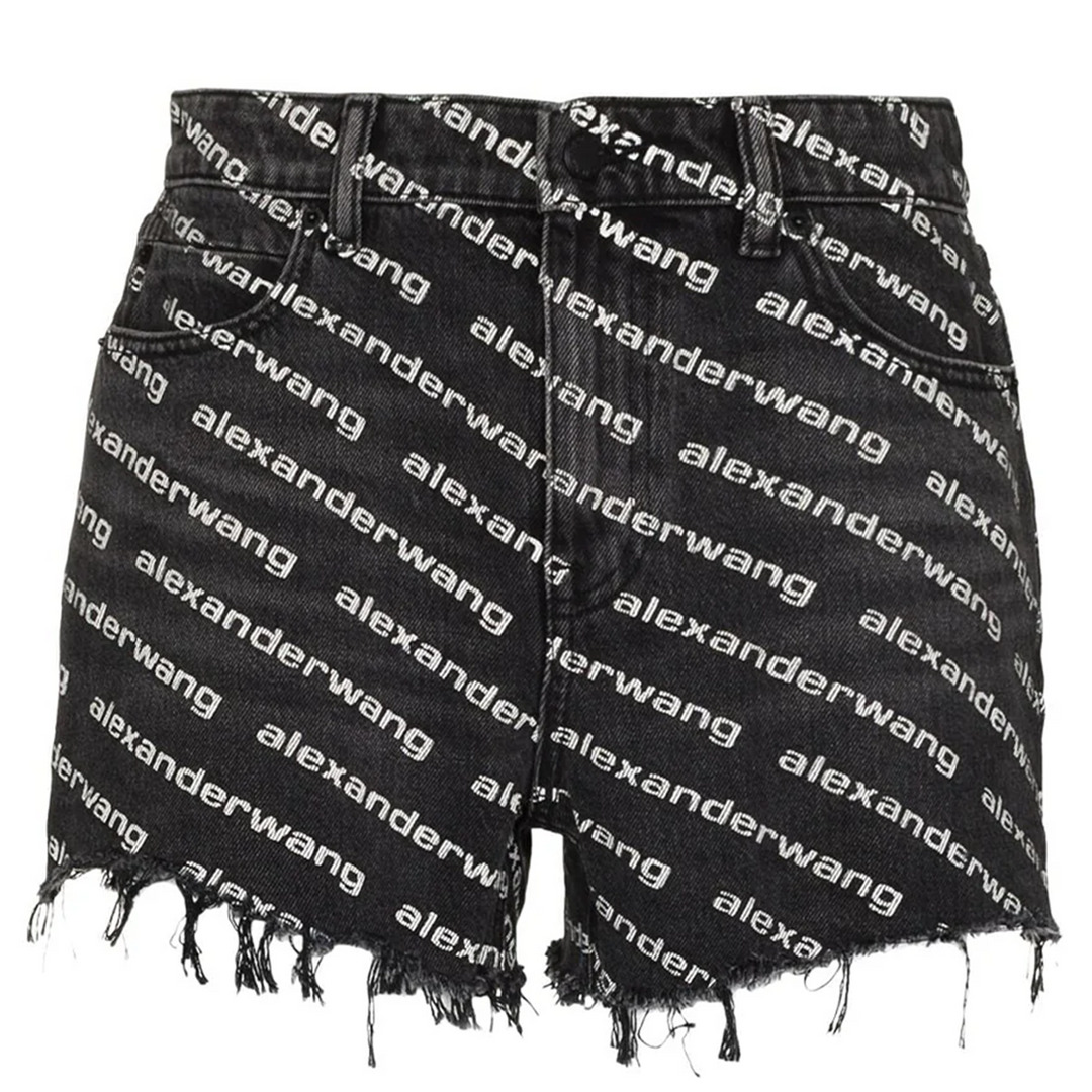 Alexander Wang Bite Shorts Grey Aged With White Logo These rebellious shorts boast a fearless edge, featuring a distinctive logo print that screams attitude. Embrace the raw allure of distressed denim while making an unabashed style statement. - 100% Cotton - Grey - High waist - Logo print throughout - Frayed hems - Leather logo patch at back waistband