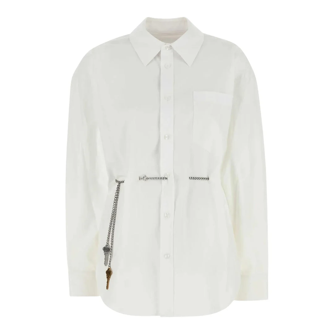 600071151WHTXXS / 1WC3251101/AWG/100 - Classic point collar - Long sleeves with button cuffs - Full button front closure - Detachable metal chain belt at waist - Crisp cotton poplin construction - Relaxed fit - Chest pocket detail Alexander Wang Button Up Shirt With Waist Chain delivers contemporary minimalism with signature hardware detailing. Crafted from crisp cotton poplin in clean white, featuring the brand's distinctive chain accent that creates a cinched silhouette. The structured tailoring and metallic hardware accent embody Alexander Wang's modern urban aesthetic.