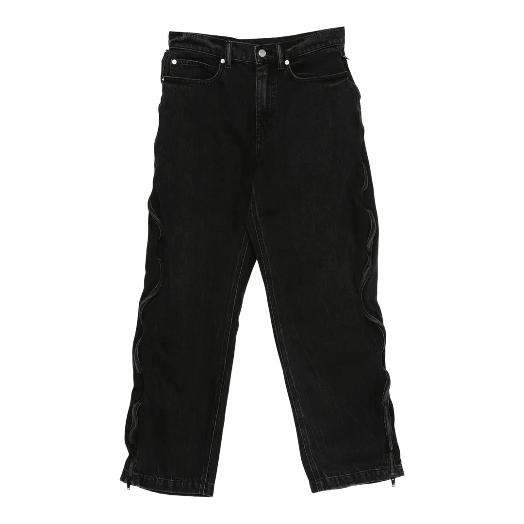 600071186BLK023 / 4DC3254881/DNM/020A - Black denim construction - Curved zipper details on legs - Classic five-pocket styling - Button fly closure - Silver-tone hardware - Regular fit through waist and hips - Cropped length Alexander Wang Curved Zipper Pants deliver avant-garde streetwear with architectural construction and contemporary edge. Crafted from premium black denim with distinctive curved zip detailing throughout the legs, creating dynamic visual lines and modern silhouette. The deconstructed design and signature Alexander Wang aesthetic transforms classic denim into a statement piece.