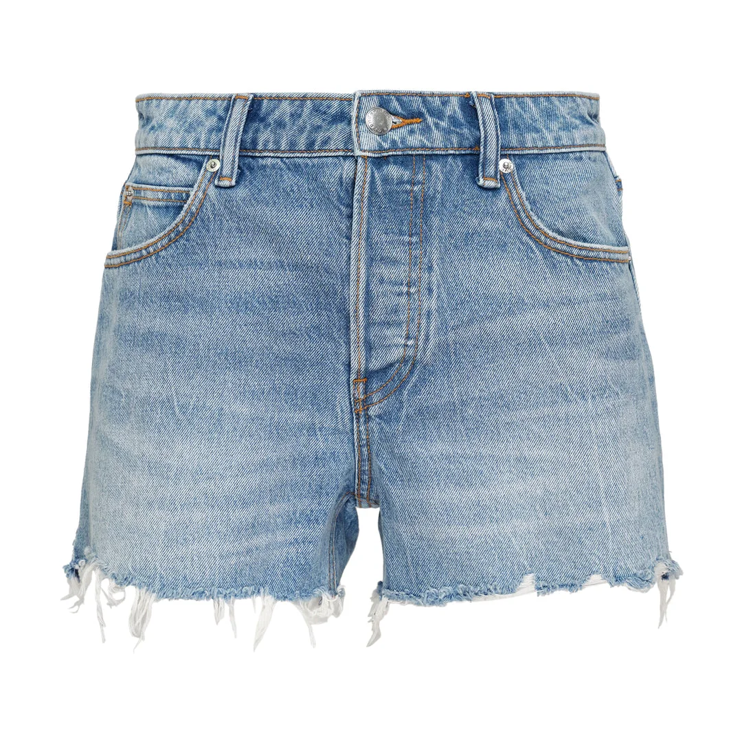 600083909DNM024 / 4DC2264164/00/427D - Classic five-pocket construction - Button fly closure - Frayed raw hem edges - Distressed logo detailing - Mid-rise waistband - Relaxed fit through thigh - Premium denim construction Alexander Wang Distressed Logo Bite Shorts delivers contemporary streetwear with signature distressed detailing and logo elements. Crafted from premium denim in classic blue wash, featuring frayed hemlines and authentic vintage-inspired finishing. The relaxed fit and deconstructed aesthetic create an effortlessly cool statement piece for modern wardrobes.