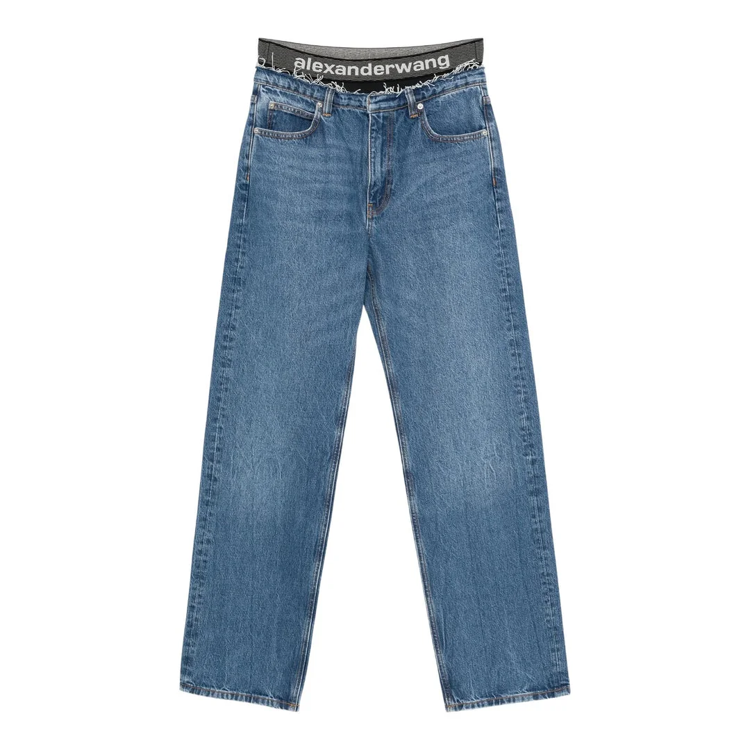 600071179DNM023 / 4DC3254752/DNM/473 - Elastic waistband with Alexander Wang branding - Classic five-pocket construction - Button fly closure - Mid-weight cotton denim - Straight leg fit - Medium blue wash Alexander Wang Ez Jeans deliver contemporary streetwear luxury with effortless urban styling. Crafted from premium mid-weight denim in classic blue wash, featuring the brand's signature relaxed fit and modern construction. The straight-leg silhouette and branded elastic waistband create a perfect balance of comfort and designer edge.