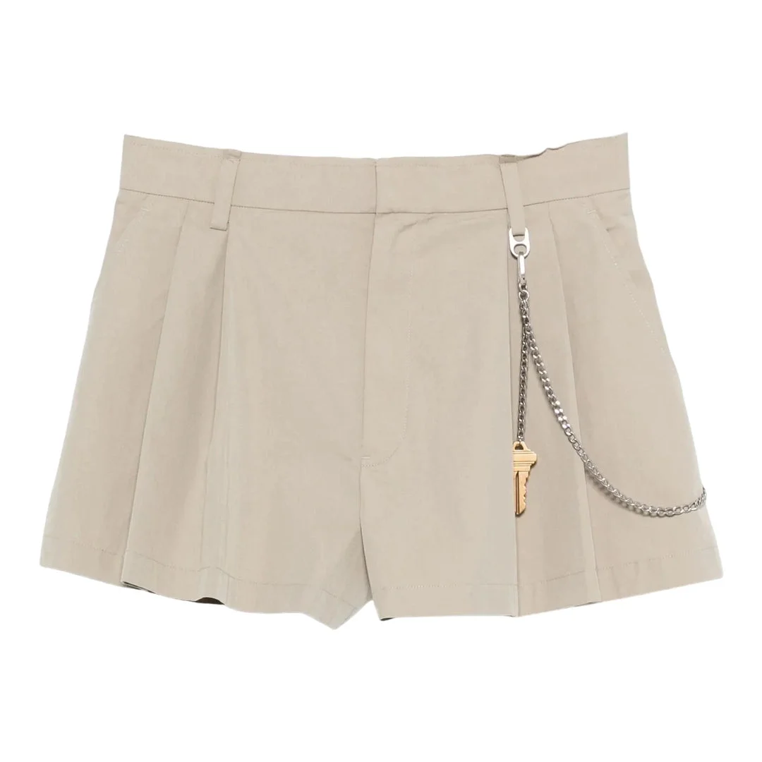 300048556KHA-02 / P51WC3254884/00/051 - High-rise waistband - Front zip and hook closure - Pressed front creases - Detachable chain with key charm - Side slash pockets - Structured cotton blend construction - Tailored fit Alexander Wang High-Rise Short With Chain Detail delivers elevated streetwear sophistication with architectural tailoring and signature hardware accents. Crafted from structured cotton blend in sophisticated beige, featuring pressed creases and a statement gold-tone key chain detail. The high-waisted silhouette and minimal aesthetic create a refined statement piece for contemporary wardrobes.