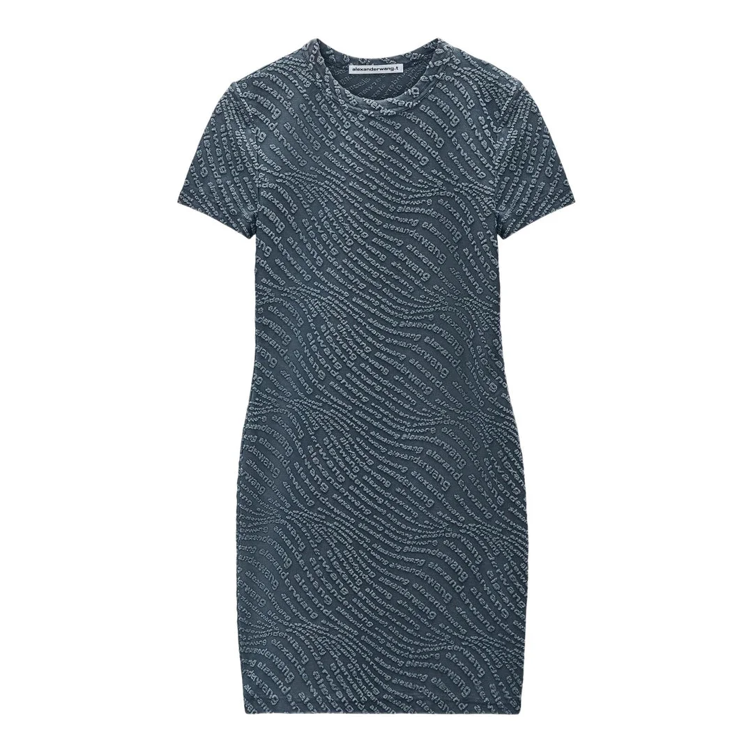 300048646GRY-XS / P54CC3256827/00/531 - Crew neckline - Short sleeves - Allover logo jacquard pattern - Stretch cotton blend construction - Mini length - Fitted silhouette Alexander Wang Jacquard Logo Mini Dress delivers contemporary street luxury with signature branding throughout. Crafted from stretch cotton blend in charcoal gray with allover logo jacquard pattern creating textural dimension. The fitted silhouette and crew neckline showcase the brand's modern urban aesthetic.