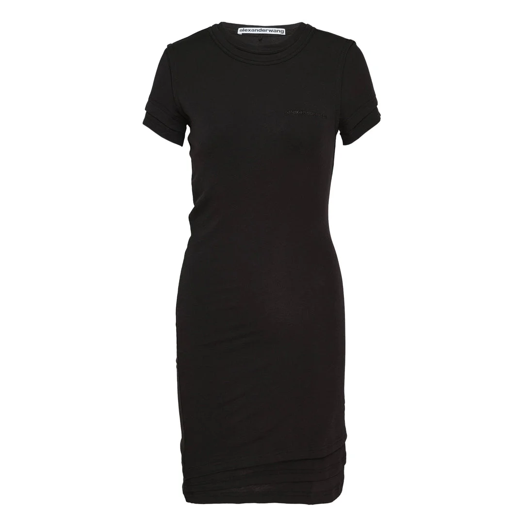600083874BLK0XS / 1CC2266987/00/001 - Short sleeve construction - Layered hem detail - Crew neckline - Body-conscious fit - Stretch knit fabric - Mini length - Alexander Wang label at neckline Alexander Wang Layered Short Sleeve Mini Dress delivers contemporary minimalism with architectural construction and urban sophistication. Crafted from premium stretch knit in classic black, featuring the brand's signature layered hemline detail and body-conscious silhouette. The structured fit and modern proportions create a versatile piece that transitions seamlessly from day to night.
