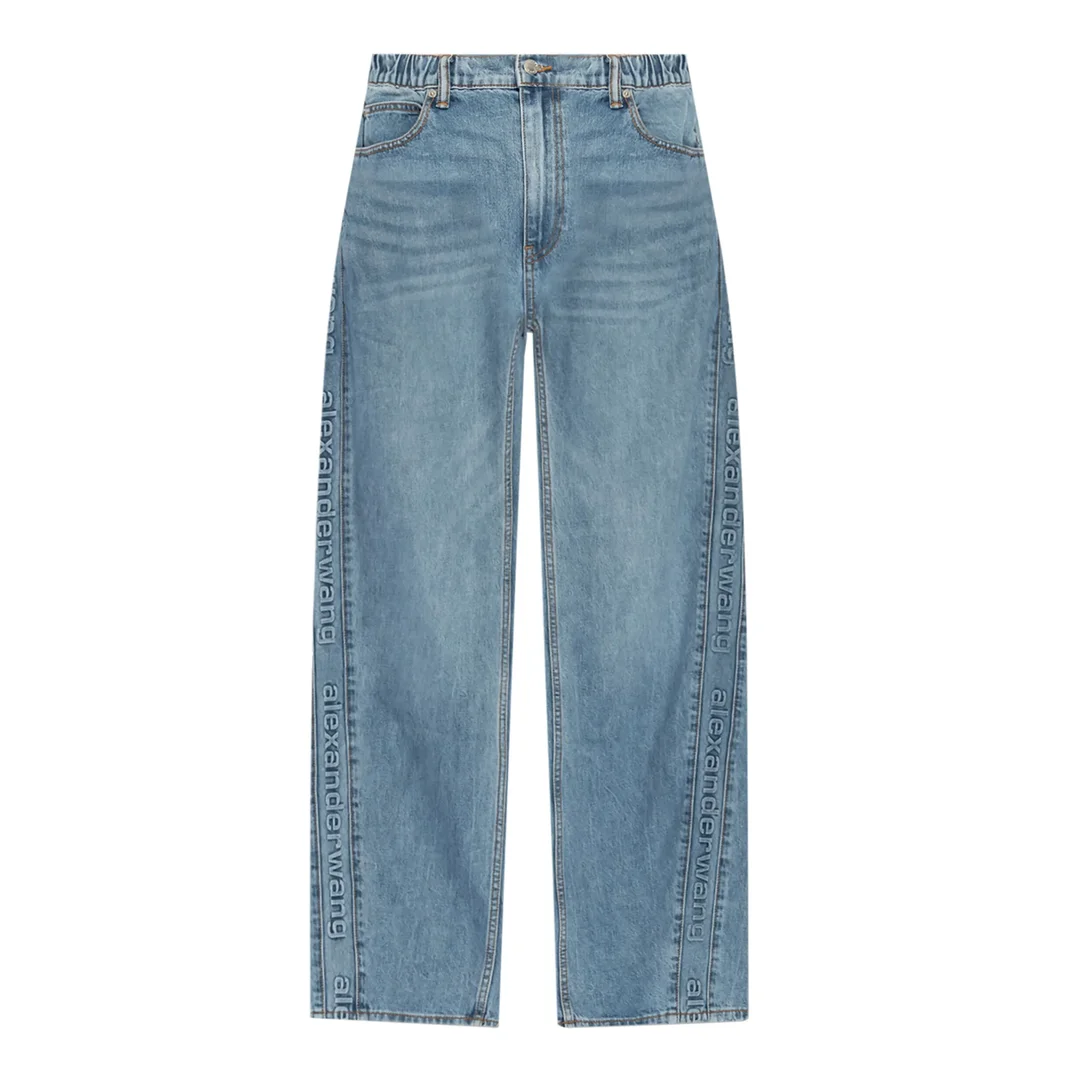 600077022IND024 / PS26-4DC3244397/00/486 - High-waisted balloon fit - Embossed Alexander Wang logo text on side seams - Five-pocket construction - Button fly closure - Light wash denim - Relaxed tapered legs - Premium cotton denim construction Alexander Wang Logo-Embossed Balloon Jeans deliver contemporary streetwear with relaxed silhouette and signature branding details. Crafted from premium denim in light wash blue, featuring embossed logo text running vertically along both side seams. The balloon fit and high-waisted construction create a modern oversized aesthetic that defines Alexander Wang's urban luxury approach.