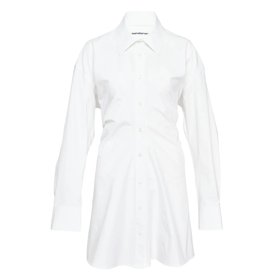 600083894WHT--0 / 1WC2266951/00/100 - Crisp white cotton poplin construction - Classic point collar - Long sleeves with button cuffs - Concealed button front placket - Gathered waist detail - Mini length - Relaxed fit Alexander Wang Long Sleeve Mini Shirt Dress delivers contemporary minimalism with sophisticated tailoring and gathered detailing. Crafted from crisp white cotton poplin with a structured shirt collar and concealed button placket for clean lines. The gathered waist detail and relaxed fit create a modern silhouette that transitions effortlessly from day to evening.