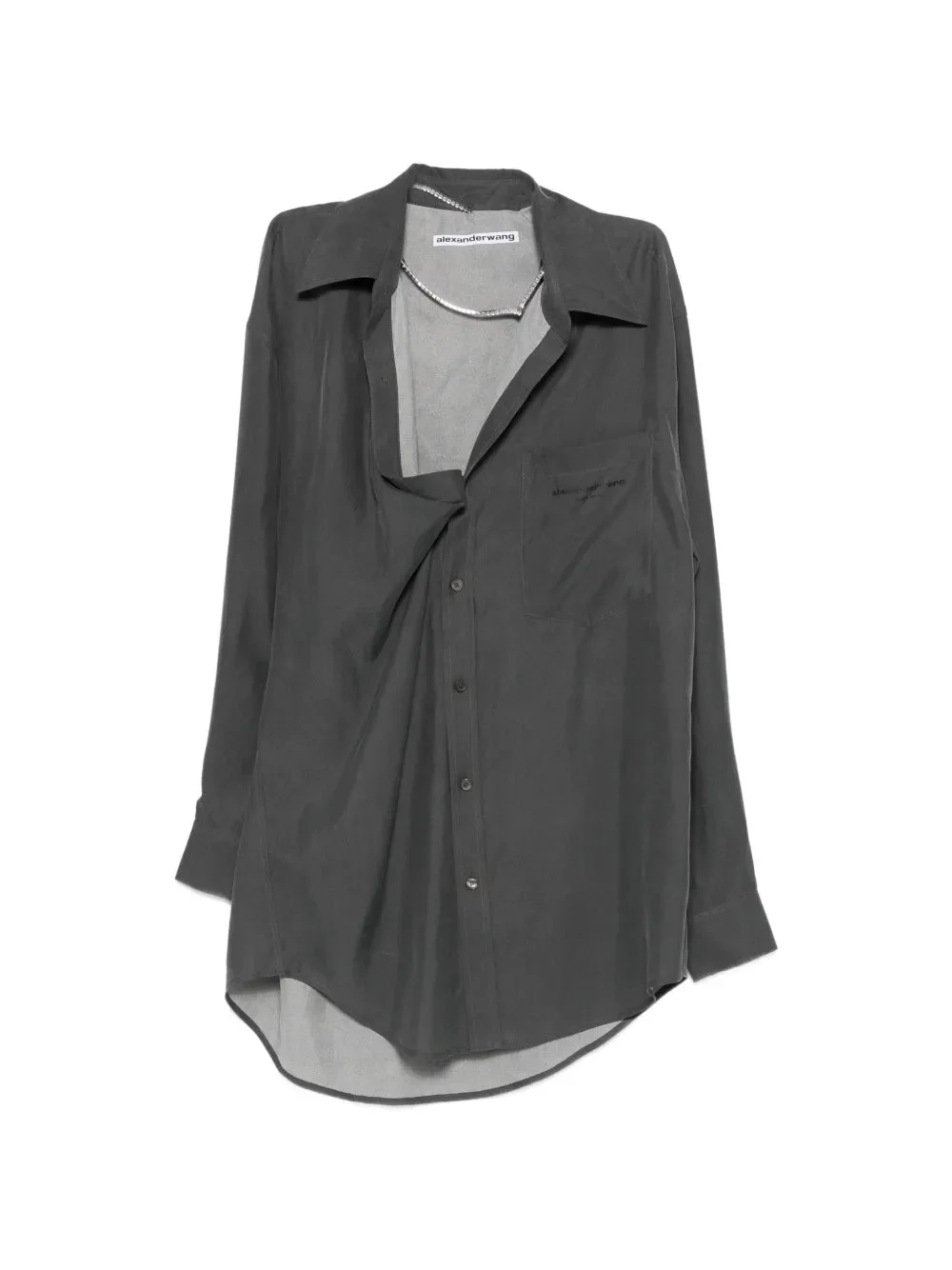 600076861GRY00L / 1WC1266949/00/022C - Off-shoulder asymmetrical neckline - Button-down front closure - Long sleeves with barrel cuffs - Curved hem with longer back - Lightweight cotton poplin construction - Relaxed oversized fit - Classic shirt collar detail Alexander Wang Off Shoulder Shirt Dress delivers contemporary sophistication with architectural draping and versatile styling options. Crafted from lightweight charcoal gray cotton poplin with a relaxed fit and asymmetrical off-shoulder construction. The signature minimalist aesthetic and convertible design create a modern statement piece that transitions seamlessly from day to evening.