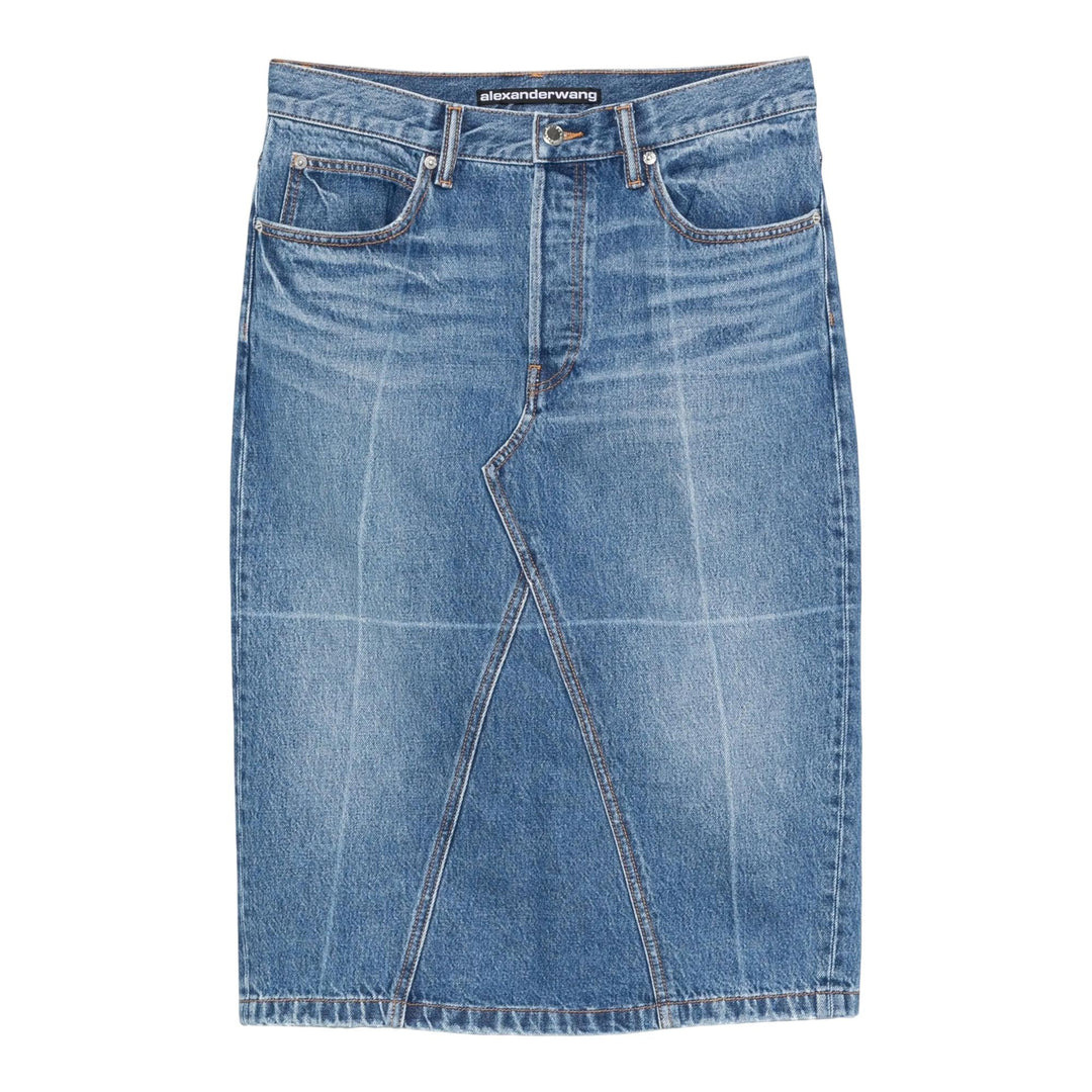 600075689DNM023 / 4DC4255849/DNM/400C - Classic five-pocket styling - Front button and zip closure - Distinctive faded fold line detail - Mid-weight cotton denim construction - Straight cut silhouette - Knee-length hem - Belt loops at waistband Alexander Wang Straight Skirt delivers modern minimalist style with distinctive architectural details and premium denim construction. Crafted from mid-weight cotton denim in classic indigo wash, featuring a unique faded fold line that creates visual interest and contemporary edge. The clean silhouette and signature Wang aesthetic offer versatile styling for effortless urban sophistication.