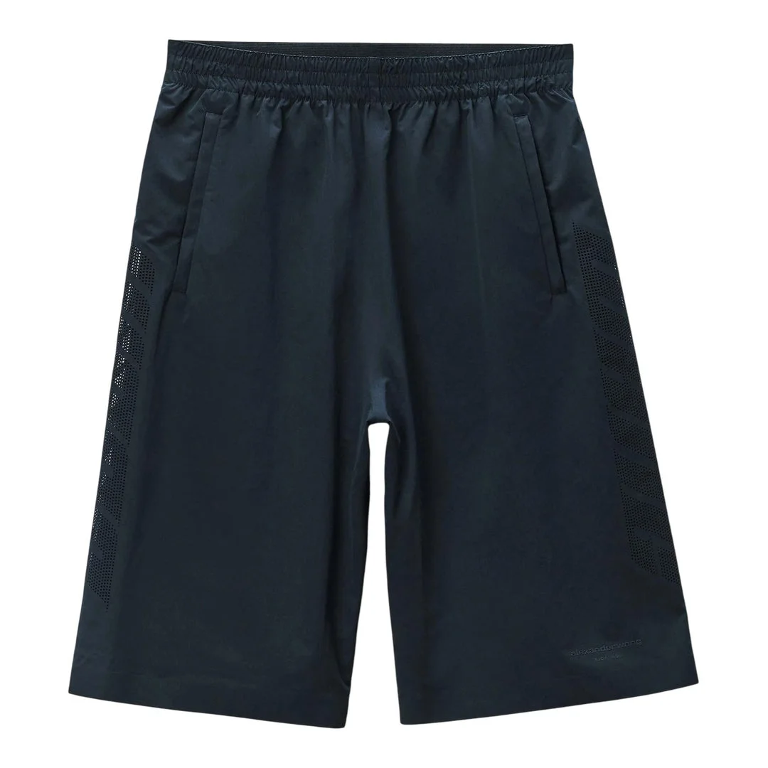 600071129BLK00S / 6WC3254102/00/001 - Elasticated waistband with drawstring - Side seam pockets - Mesh panel inserts for ventilation - Technical stretch fabric construction - Relaxed athletic fit - Above-knee length Alexander Wang Tech Basketball Shorts deliver contemporary athletic luxury with premium performance fabrication. Crafted from technical stretch fabric in deep navy, featuring mesh paneling for enhanced breathability and moisture management. The relaxed athletic fit and signature Wang construction create the perfect fusion of streetwear and performance wear.