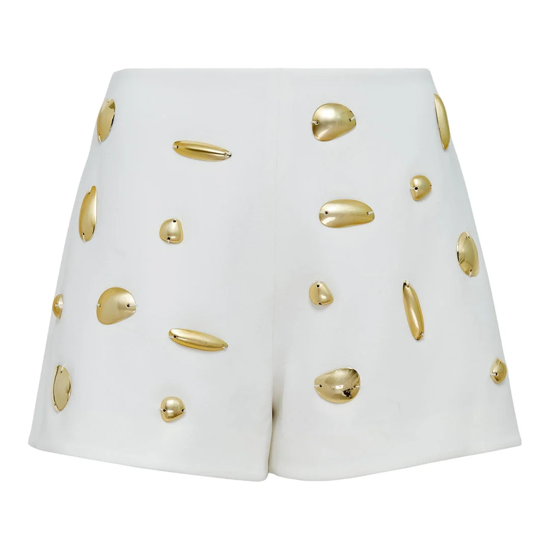 600067400WHT00S / A1250201-0322/00/WHT - Scattered golden metallic embellishments - High-waisted silhouette - Tailored fit through hips and thighs - Premium white fabric construction - Contemporary cut and finish - Statement hardware detailing The ALEXIS Kanya Shorts deliver contemporary femininity with statement metallic embellishments and refined tailoring. Crafted from premium white fabric featuring scattered golden hardware accents throughout, creating a luxurious textural contrast. The modern silhouette and signature ALEXIS attention to detail make these shorts a standout piece for elevated casual styling.