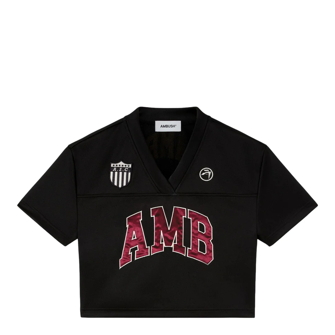 300043798BLK-LL / A4BWBD002F24JER0011028/00/1028 - V-neck collar design - Short sleeves - Cropped hemline - AMR collegiate lettering print - Contrast red graphic details - Soft cotton jersey construction - Relaxed fit AMBUSH Crop T-Shirt delivers contemporary streetwear with Japanese-inspired design aesthetics and premium construction. Crafted from soft cotton jersey in classic black, featuring collegiate-style AMR lettering and signature brand detailing. The cropped silhouette and V-neck design create a modern statement piece for elevated casual styling.