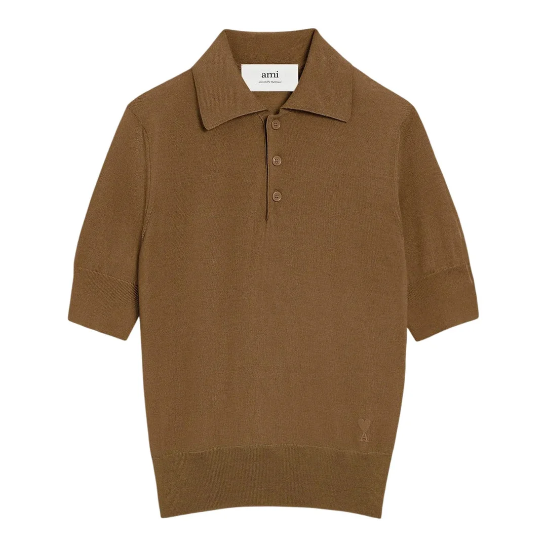 300048663BRN-SS / A5H25FPL412.KN0066/00/216H25 - Three-button placket closure - Classic polo collar - Half-length sleeves - Extrafine wool and silk blend construction - Ribbed collar and cuff details - Regular fit - Signature AMI branding AMI Extrafine Wool Blend Silk Knit Polo delivers refined Parisian elegance with luxurious material composition and sophisticated craftsmanship. Crafted from an extrafine wool and silk blend in rich camel brown, featuring a classic three-button placket and ribbed collar details. The premium knit construction and signature AMI aesthetic create a versatile piece that transitions seamlessly from casual to smart-casual occasions.