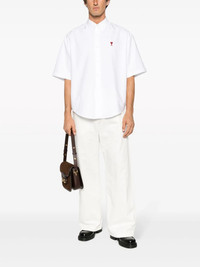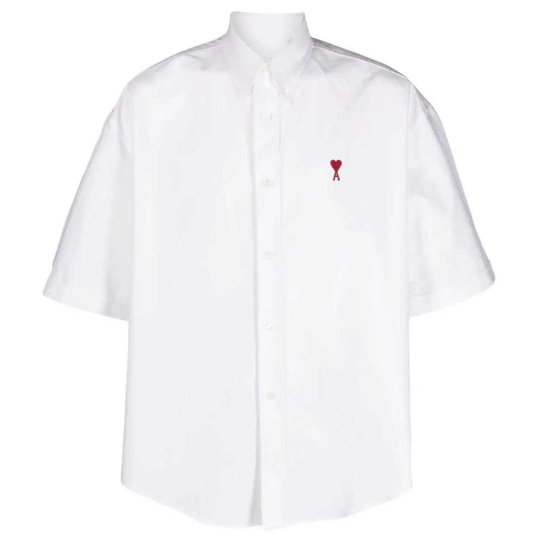 AMI Paris Boxy Fit Shirt Elevate your wardrobe with our Boxy Fit Shirt, meticulously tailored for a contemporary silhouette that effortlessly combines comfort and style. The eye-catching red Ami de Coeur chest embroidery adds a bold touch, ensuring you stand out in any casual setting.
