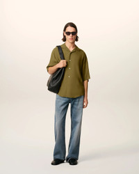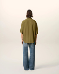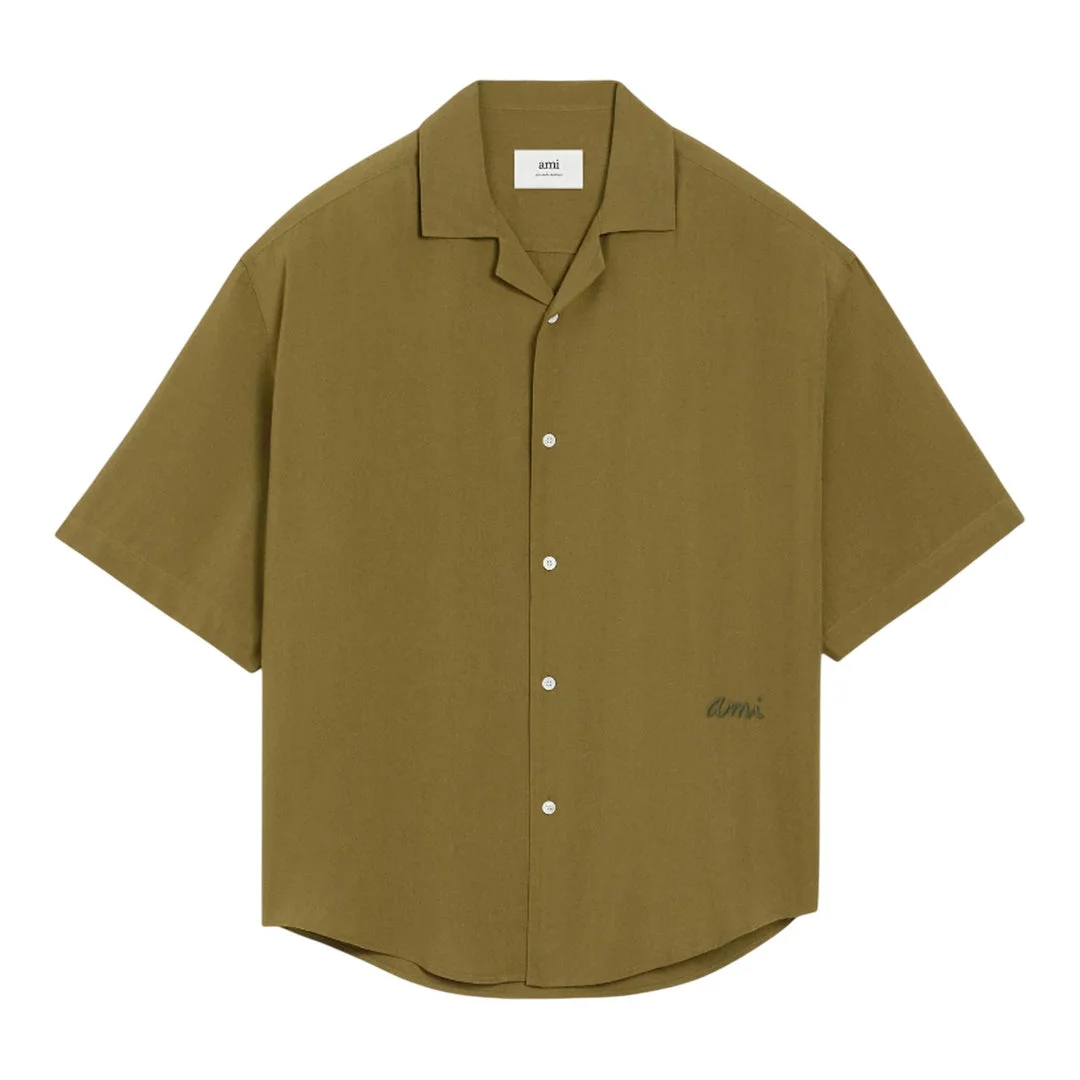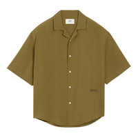 600072154OLV038 / HSH768.VI0036/00/298 - Camp collar design - Short sleeves - Button-front closure with white buttons - Embroidered AMI logo detail - Premium cotton construction - Relaxed fit - Curved hemline AMI Camp Collar Shirt delivers effortless Parisian sophistication with vacation-inspired styling and relaxed silhouette. Crafted from premium cotton in sophisticated olive green, featuring the brand's signature camp collar construction and short sleeves. The relaxed fit and classic button closure create a versatile wardrobe essential perfect for casual elegance.
