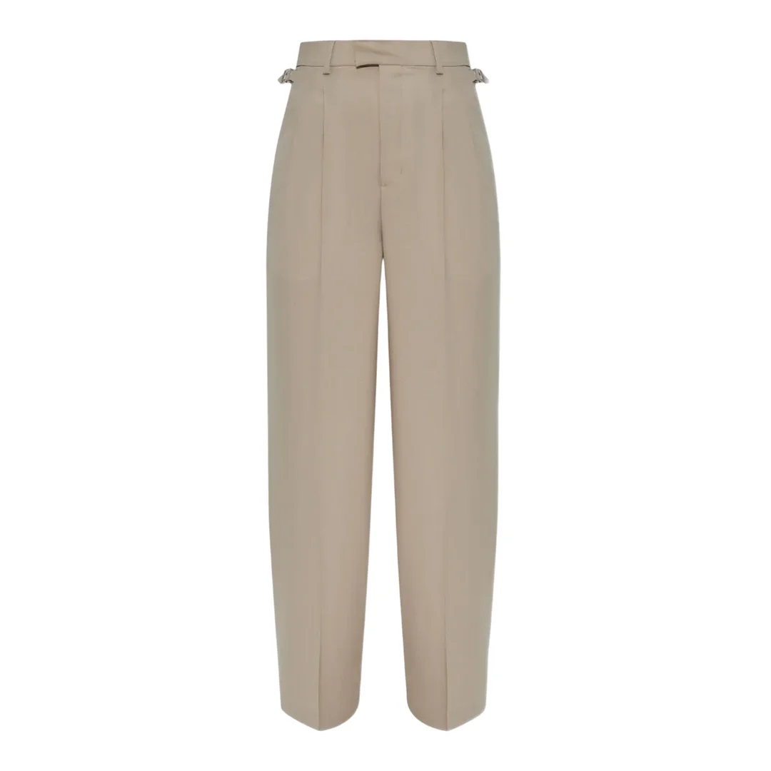 600072121BGE034 / FTR818.WV0066/00/229 - High-waisted design with belt loops - Front pleated detailing - Side adjustable buckle straps - Wide-leg relaxed fit - Premium wool blend construction - Front zip and hook closure - Side seam pockets AMI High Waist Pants deliver elevated tailoring with contemporary Parisian sophistication and versatile styling options. Crafted from premium wool blend fabric in neutral beige, featuring precise pleating and structured high-waist construction for flattering silhouette. The relaxed wide-leg cut and refined minimalism embody AMI's signature approach to modern luxury essentials.
