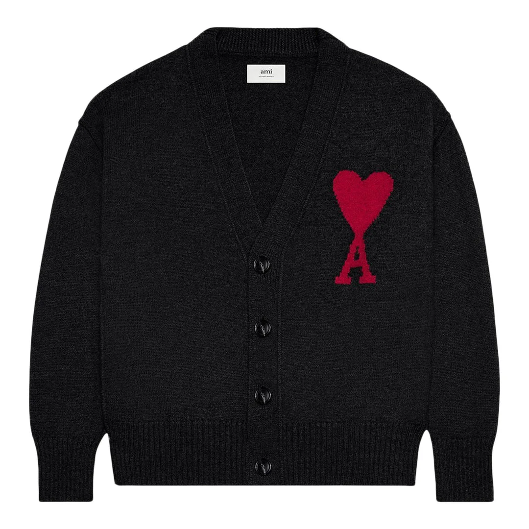 600036447BLK0XS / BFUKC006.018/00/009 - Signature red heart 'A' logo embroidery - Button-front closure with black buttons - V-neck design - Ribbed cuffs and hem - Premium wool construction - Relaxed fit AMI Red De Coeur Cardigan delivers Parisian elegance with the brand's signature heart logo embroidery. Crafted from premium wool knit in classic black, featuring the iconic red heart 'A' motif on the chest and traditional button-front closure. The relaxed fit and ribbed detailing showcase AMI's sophisticated approach to contemporary French luxury knitwear.