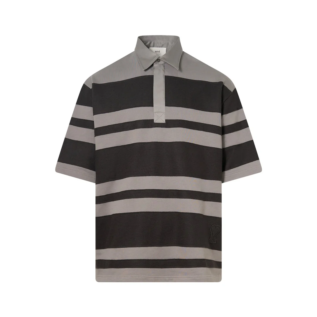 600072192GRY00S / UPL414.JE0168/00/059 - Classic polo collar with placket closure - Short sleeves - Horizontal stripe pattern - Premium cotton pique construction - Relaxed fit - AMI embroidered logo detail The AMI Striped Polo delivers contemporary Parisian elegance with relaxed sophistication and versatile styling. Crafted from premium cotton pique in charcoal and grey horizontal stripes, featuring a classic collar and short sleeves for effortless comfort. The refined proportions and signature AMI aesthetic create a modern essential for elevated casual wardrobes.